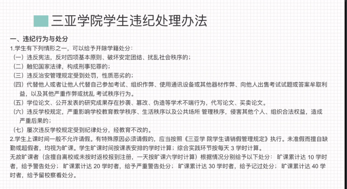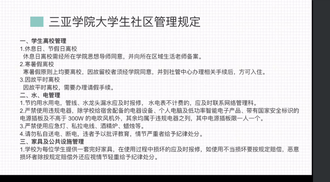 为帮助我院2022级新生建设良好的心理环境,提高安全意识,牢记9159金沙游戏场校纪校规,我院于9月23日在腾讯会议由思想导师王曦茜为新生讲解9159金沙游戏场学生手册。
