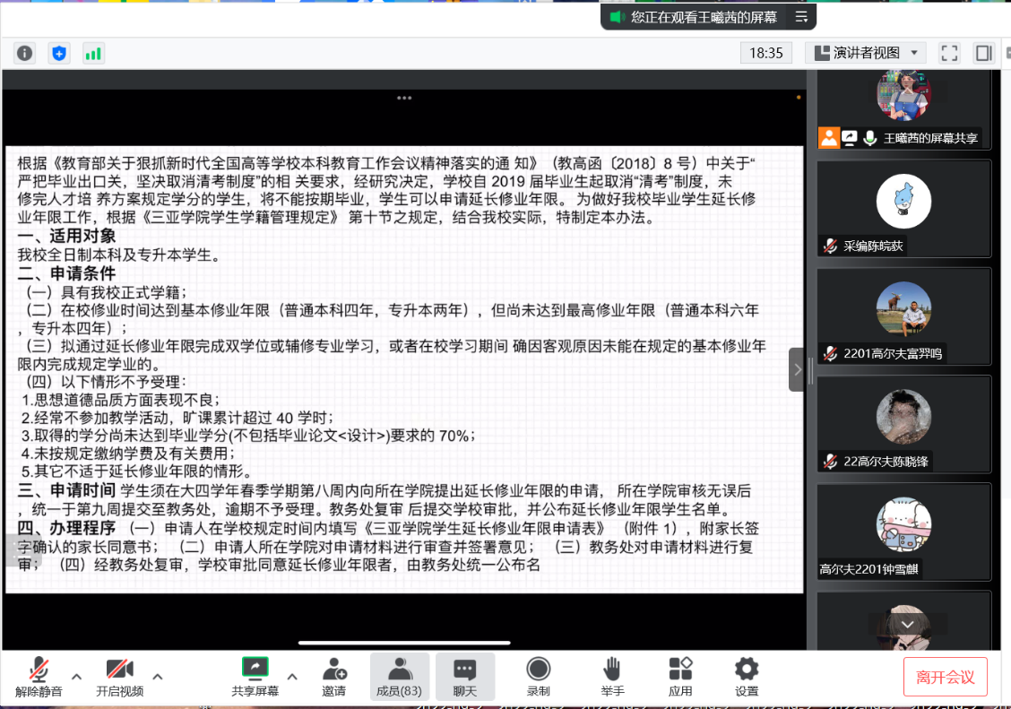 最后,王曦茜老师讲解了综合素质评定的办法。王曦茜老师强调在大学期间最好不要有重修的科目,学校自2019届毕业生后取消了“清考”制度。未修完人才培养方案规定学分的学生,将不能按期毕业,学生需要申请延长修业年限。