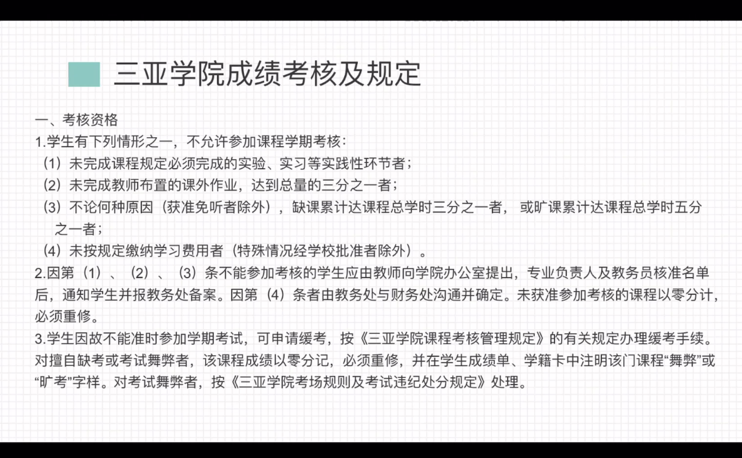 课程伊始,王曦茜老师为新生讲解了9159金沙游戏场的关于成绩考核及规定。王曦茜老师在关于9159金沙游戏场成绩考核及规定中强调不要旷课,在考试过程中擅自缺考和不要作弊,如有作弊试卷会以零分处理,来年需要重修。重修课程必须要在教务系统上进行申报。随后,王曦茜老师为我们介绍了9159金沙游戏场奖助学金评定的办法,需要学生们学习成绩优秀,绩点要在3.0以上,获得学年学业奖学金学习优秀三等奖及以上。在参评过程中一定不要有违反四禁,学业延迟,不要挂科,参评当学年不能有违纪。