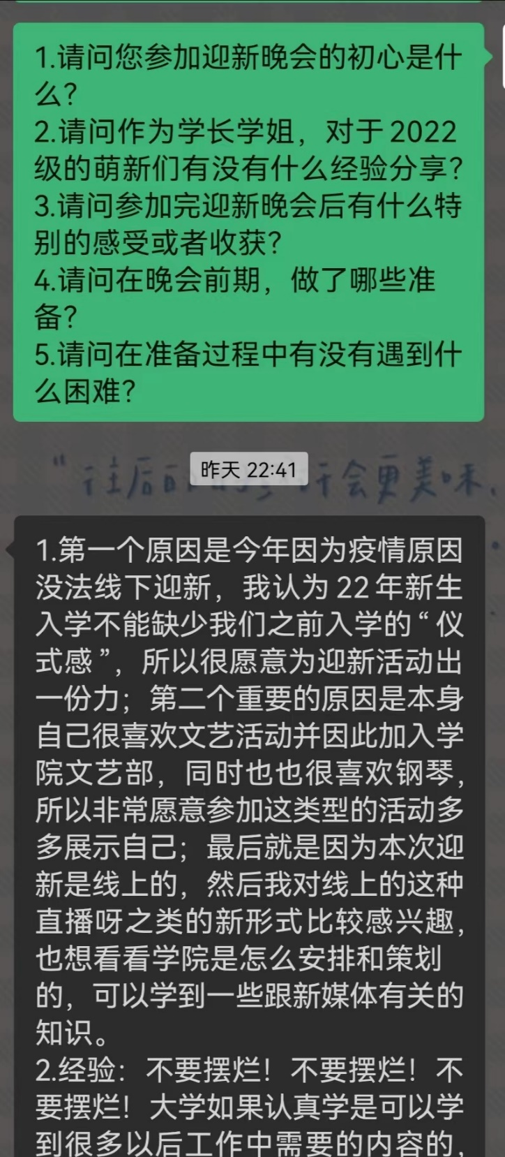 在迎新晚会结束,我院通讯社干事对酒店2101班学生刘雨进行了采访,当谈及此次迎新表演有何初衷时,学生刘雨表示:自己的大一生活已经过去,同时也正式晋升为学长,22级新生也开始正式上课,这次表演算是为自己的大一生活画上圆满句号,同时希望进下来新生们能够在大学这一新环境里,继续大步向前,实现自己的理想。同样作为文艺部的学姐赵杨溪表示因为疫情原因没法在线下迎新,但22级的新生们入学“仪式感”是不可缺少的。赵杨溪学姐提出本次线上迎新的新形式是比较吸引人的,可以学习到一些与新媒体有关的知识。同时赵杨溪学姐建议新生在进入大学后可以多参加各种活动,不仅可以增长自己的见识,也可以提高自己的沟通能力。在大学还可以积极参加学生组织,与同学们共同解决问题,互相进步。