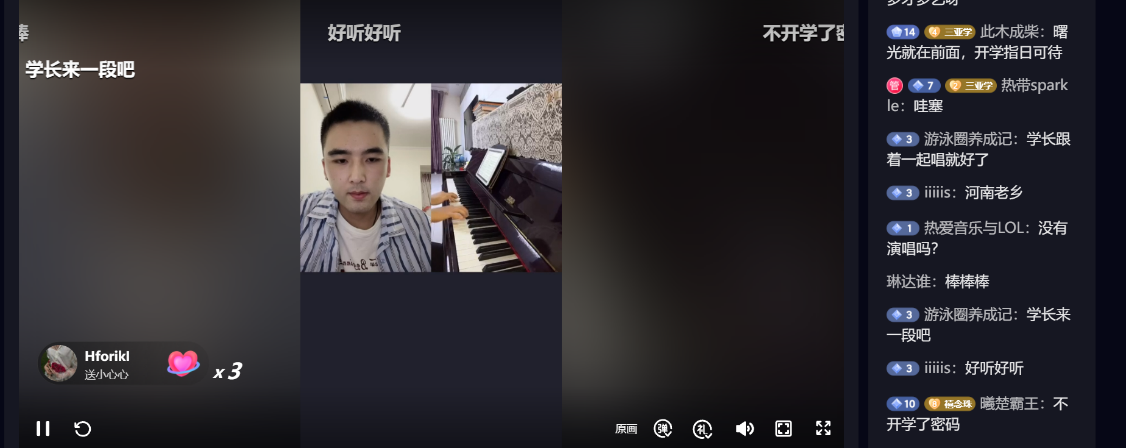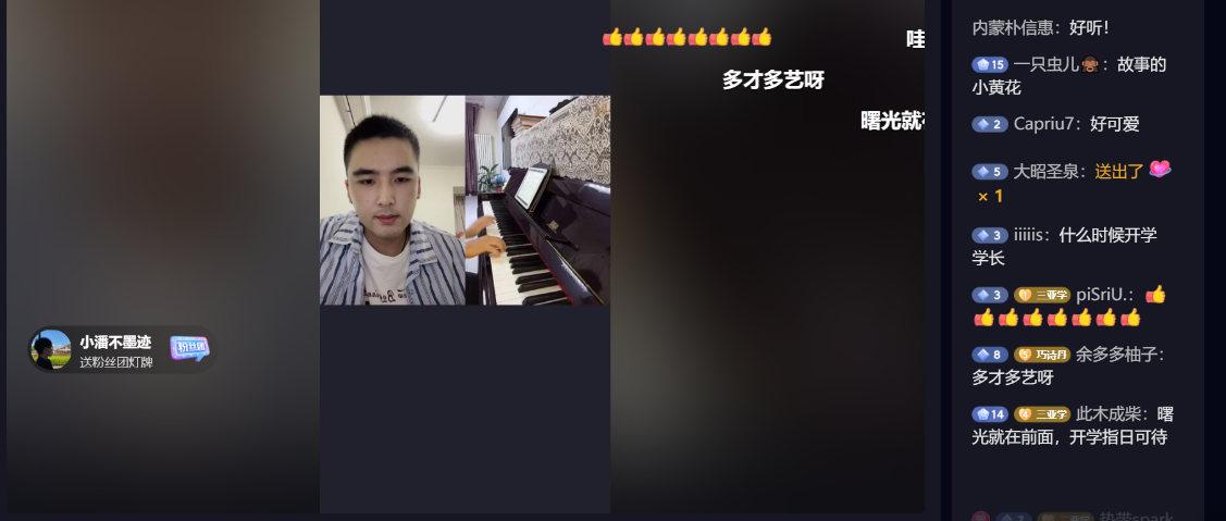 紧接着,就到了我院学生精心准备的节目表演。第一个由我院学生会文艺部赵杨溪为各位新生带来钢琴独奏《晴天》。优美的旋律,即使无法面对面欣赏,但仍能够身临其境去感受到其音律美。随后,邮轮1901班许祎学长为新生带来经典歌曲《平凡之路》,虽然这首歌听起来耳熟能详,但是在这一盛大场合下进行演唱,唱出了许多人的心声,诚恳,坦荡,令人回味无穷。同时也希望即将踏入校园的新生用这平凡的心态挑战属于自己的不平凡人生。