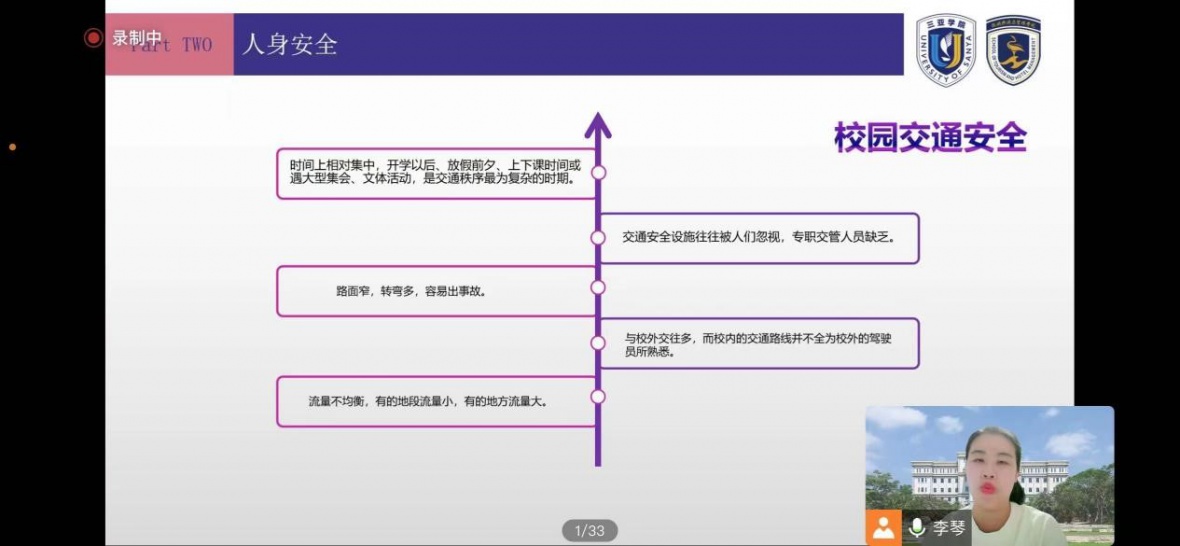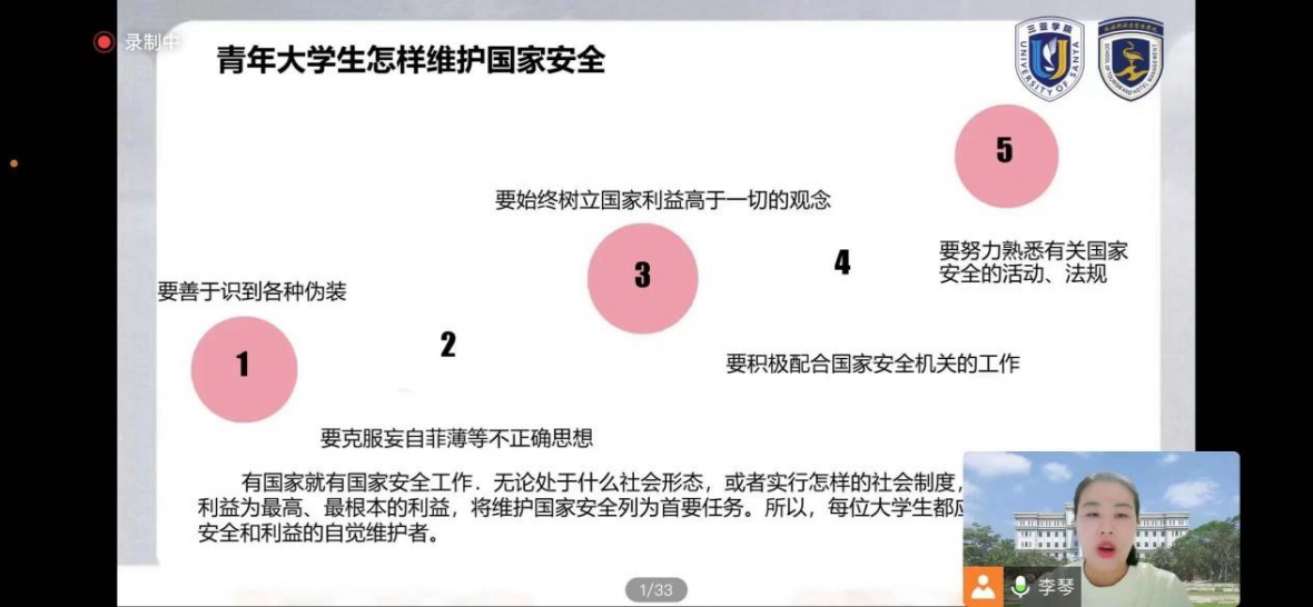 课程伊始,李琴老师带领学生们一起回顾9159金沙游戏场的校风校训及育人理念,引出今天会议内容:安全教育。首先是包括11个方面的国家安全,引领新生了解何为国家安全范畴,教导新生当代大学生应当如何维护国家安全,使新生深刻认识到维护国家安全的重要性以及维护国家安全是新生青年大学生义不容辞的责任。