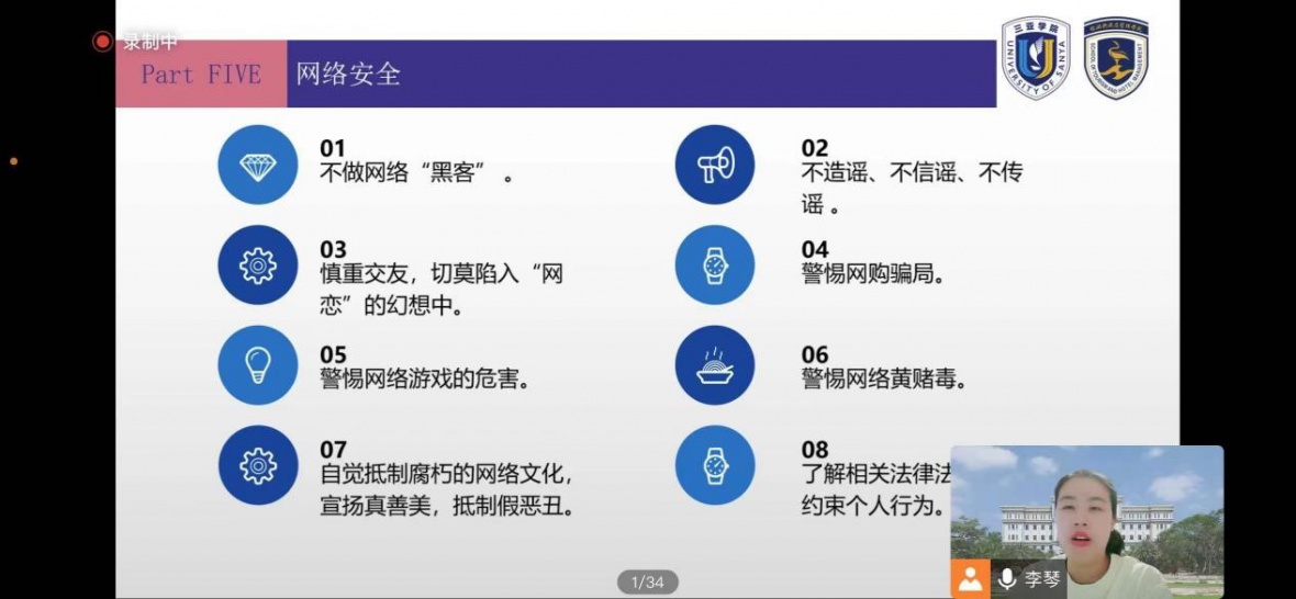 随后,李琴老师为新生讲解了网络安全。网络是把双刃剑,可以帮助新生追求新知,开阔视野,获得更广阔的学习渠道丰富新生的生活,但同样也有负面影响,网络的开放多元充满虚拟性和无约束性,不安全和不可控因素也随之即来,学生们要合理利用网络资源不信谣、不造谣、不传谣,共同维护网络安全,警惕网络陷阱。网络不是不法之地,新生要自觉抵制腐朽网络文化,弘扬真善美!