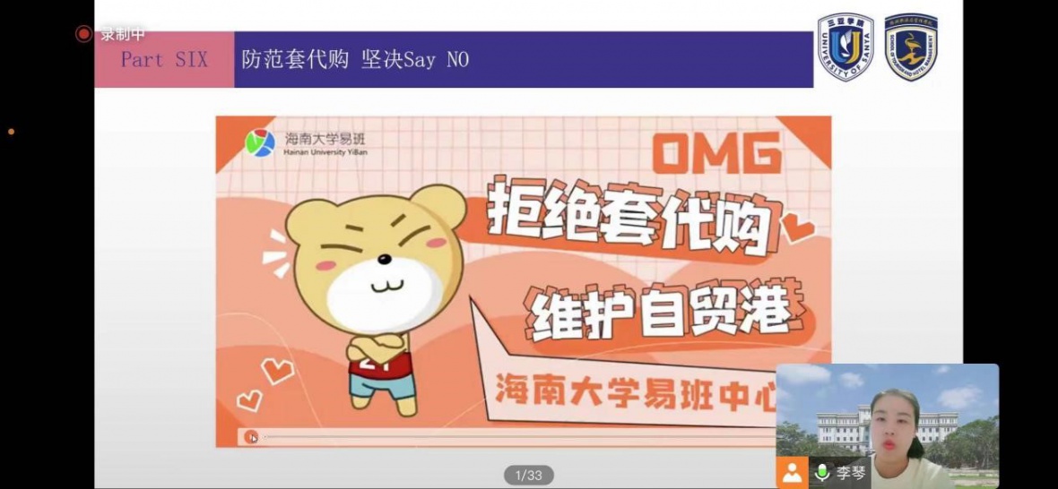 课程最后,李琴老师为新生讲解了防范套代购。通过视频了解到代购违法行为,并通过海南离岛旅客免税购物政策公告加深学生们防范套代购意识,知法、懂法、不犯法。呼吁学生们共同维护法律法规,做到法无授权不可为,运用法律维护好自身权益!