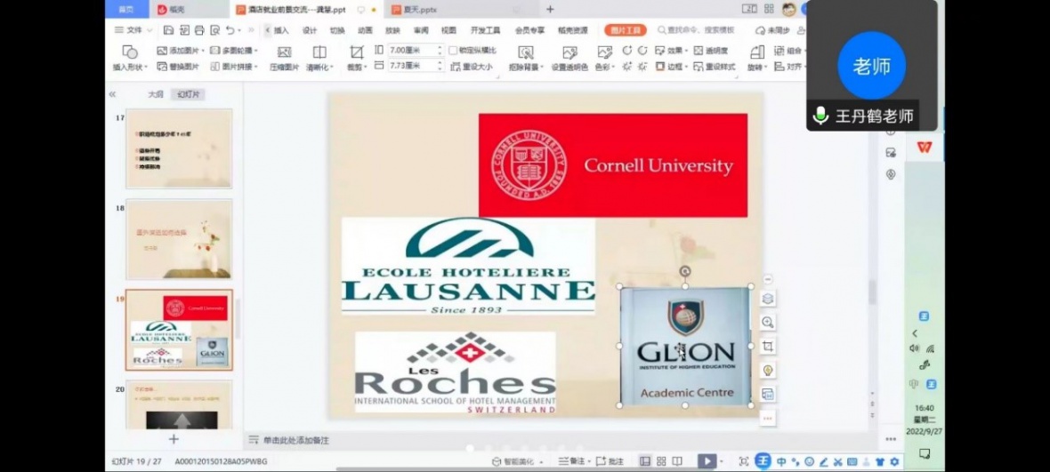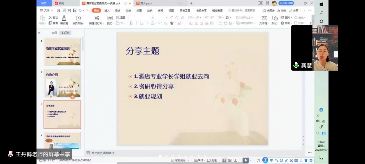酒店行业不断发展,为让22级新生更好的了解酒店行业以及今后就业问题。我院酒店专业老师王丹鹤、龚慧在9月27日于腾讯会议为22级酒店新生讲解“酒店专业的就业前景及创业与考研”课程。