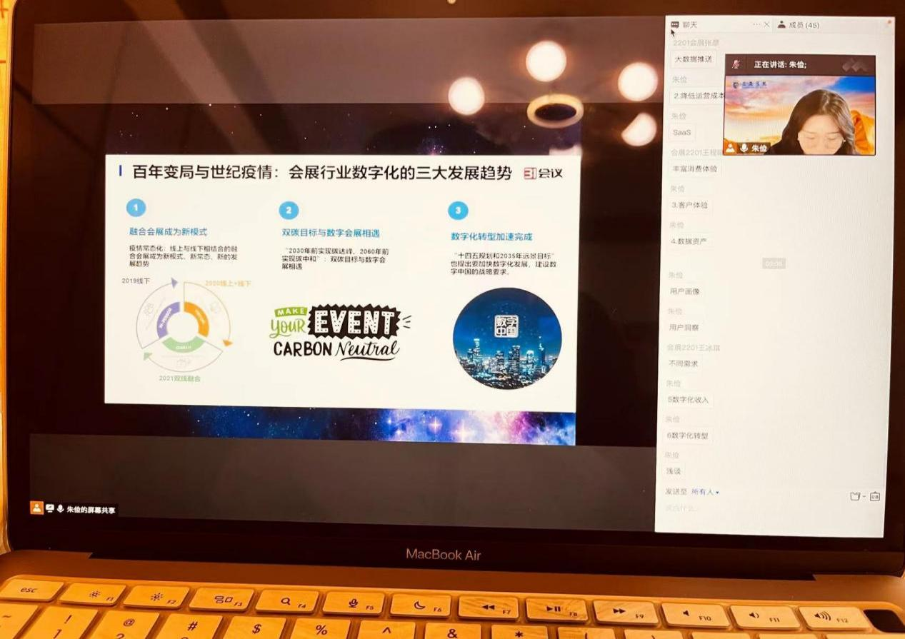 紧接着,朱俭老师为新生们介绍了许多著名的线上会展,解释了疫情为线上会展带来的挑战与机遇。在疫情出现前,一些活动的核心都在依靠人力去解决问题,而数字化的能力就决定了一场会议是否还能举办成功,同时也催生了支撑一场线上大会举办所需要的底层技术能力、产品、解决方案的涌现。