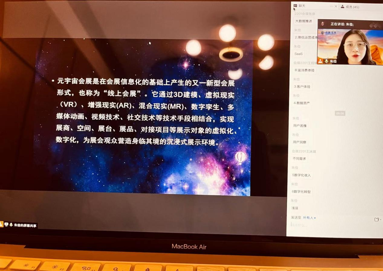 最后,朱俭老师鼓励我们数字会展的未来是需要我们去创造的,并耐心的为学生们答疑解惑。愿各位新生,在这百年未有之大变局,疫情格局下,更应该抓紧学习专业知识,不断提高自己的专业能力,在这大学的新征程上,不惧困难,负重前行。