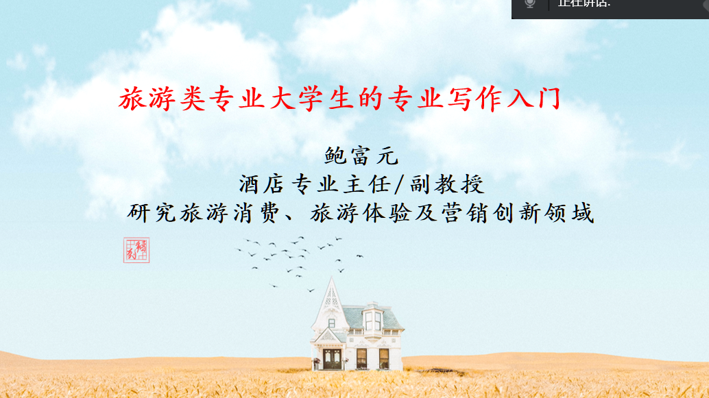 学术是一个严肃而神秘的话题,对于旅酒学院的新生而言,熟悉专业写作的标准,掌握基本的规范要求,既是未来学业生涯的必修内容,更是走进学术世界的入门要求。为帮助学院旅游类专业的全体新生了解专业写作的类型和技巧,提高专业写作能力,适应大学专业课程学习和未来职业要求。我院酒店管理专业鲍富元副教授于11月4日在线上会议室,围绕旅游类专业写作的常见类型和规范要求,为100多名同学开展了精彩的学术讲座。