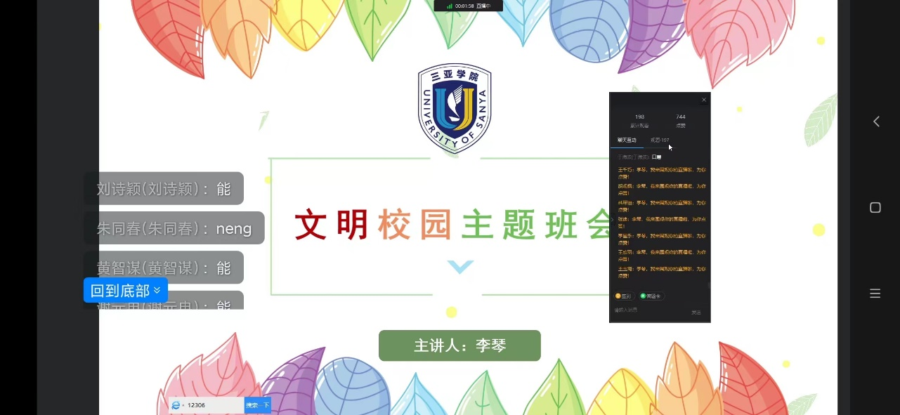 为构建文明校园,加强学风建设,11月19日晚上21:00,我院团委副书记、21级思想导师李琴老师组织21级全体学生召开文明校园主题班会。