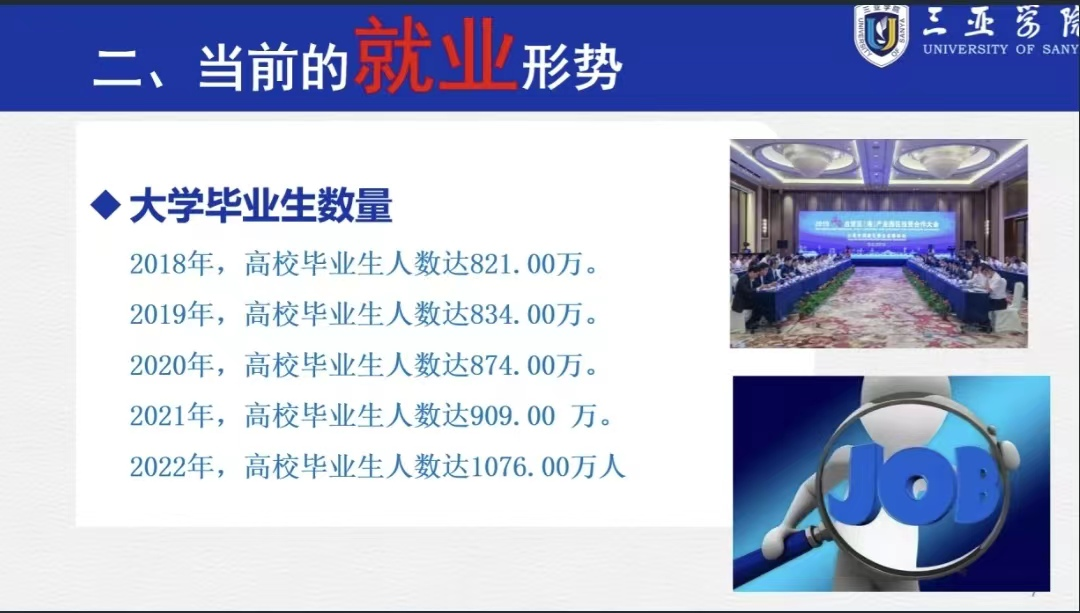 随后,杨玉英院长提出在当前就业形势下,人人都想在大学毕业后立即有一份工作,但是随着大学毕业生的数目增多,找工作的需求以及更多竞争压力由此而来。在疫情的影响下,很多企业为了保障公司的基本运作,不得不做出了许多防范,这导致就业难度的增加。