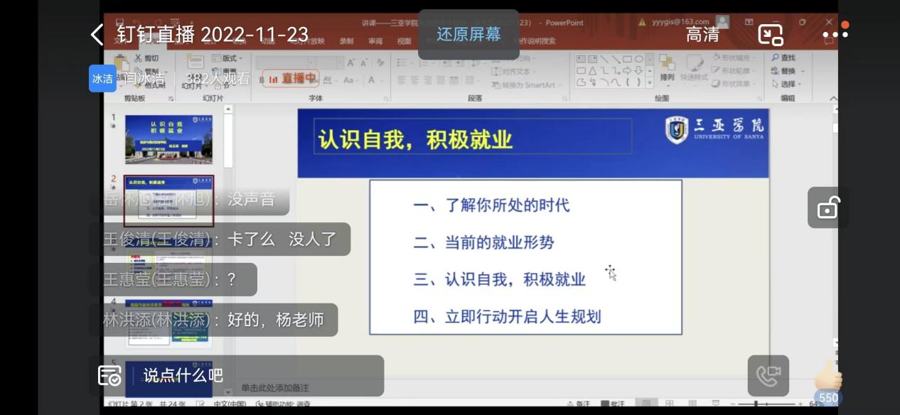 为了让我院毕业生更好地了解自身条件和了解就业情况,我院于11月23日下午2时,由杨玉英院长在钉钉上展开关于“自身条件与就业指导”,我院毕业生积极参加。