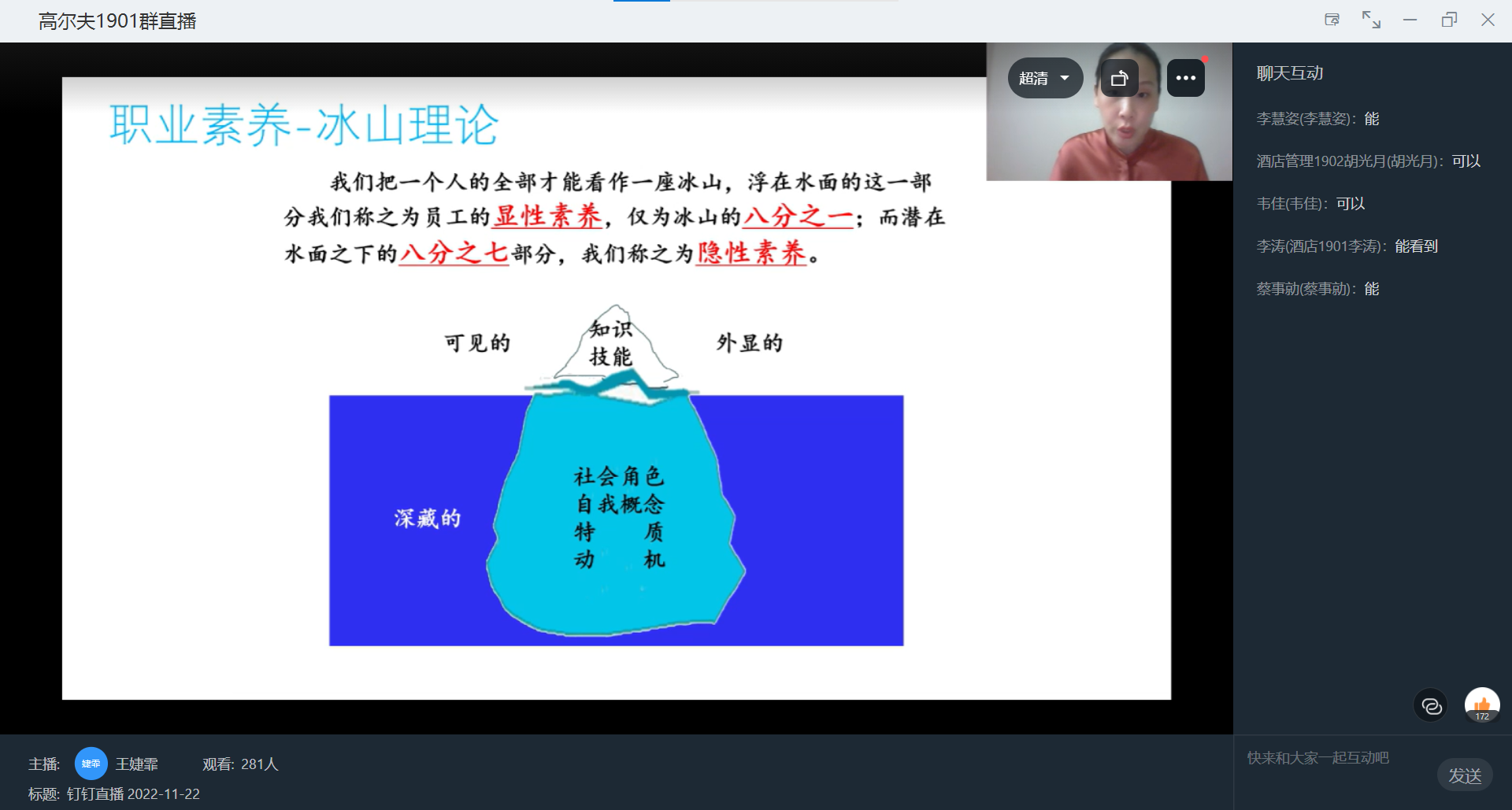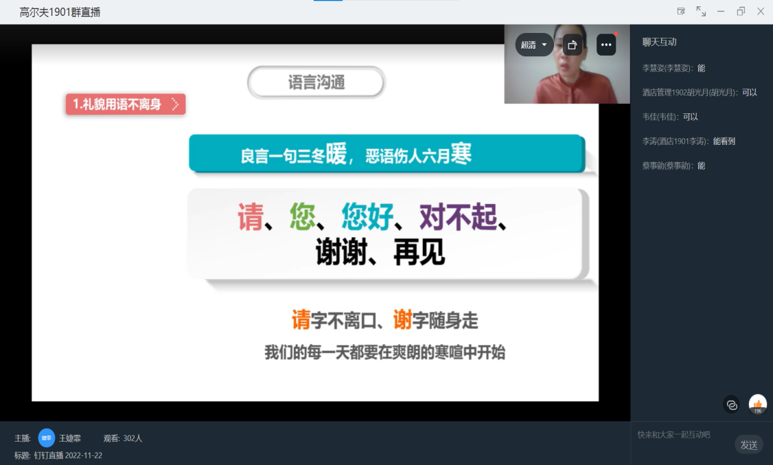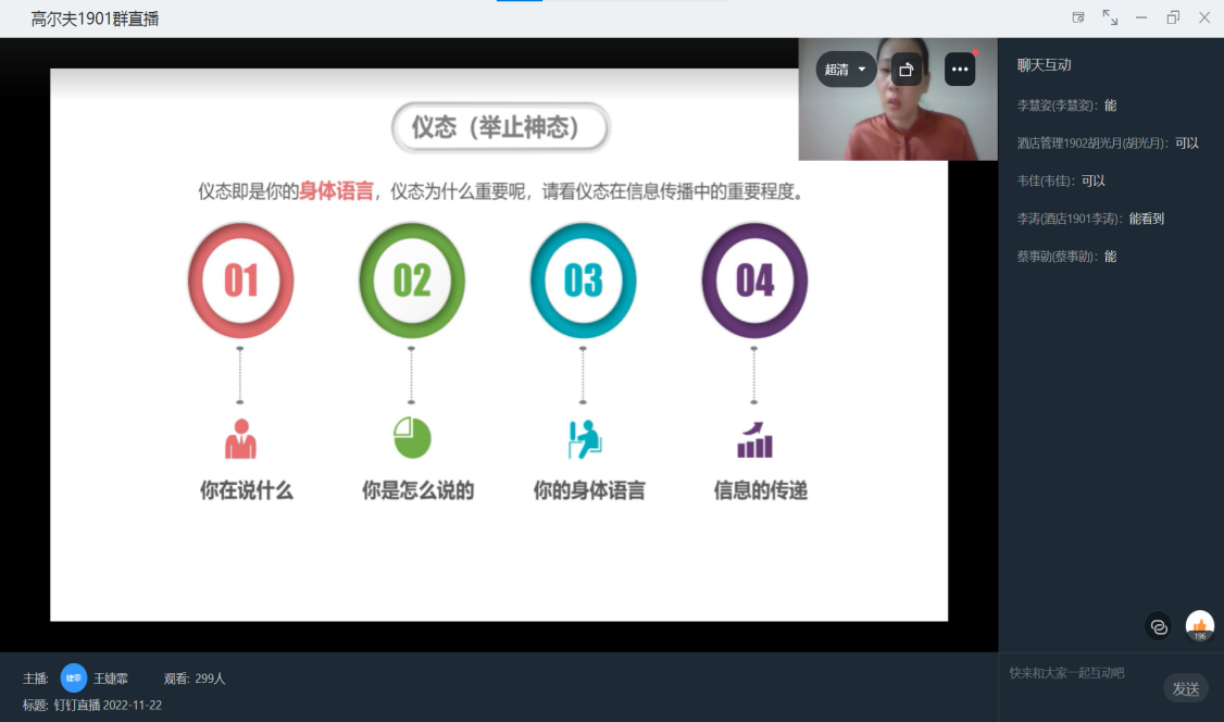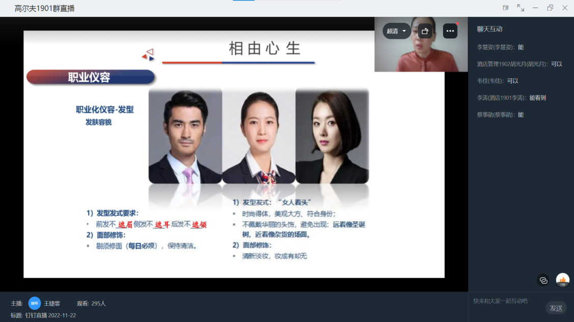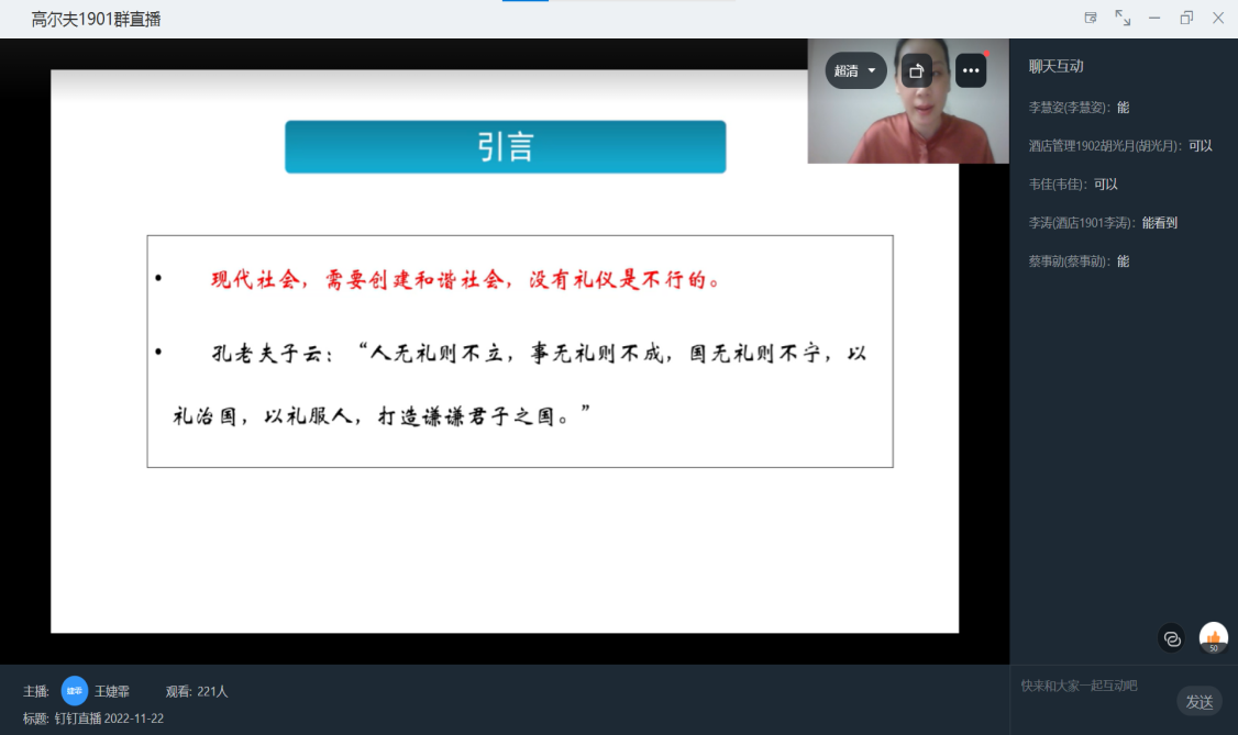 为了让我院2019级毕业生在职场中提高个人修养,培养自身的人格魅力,我院于11月22日晚上7时在线上为2019级毕业生开展礼赢职场的讲座。本次讲座由旅酒学院王婕霏老师展开讲解,我院2019级毕业生积极参与讲座。