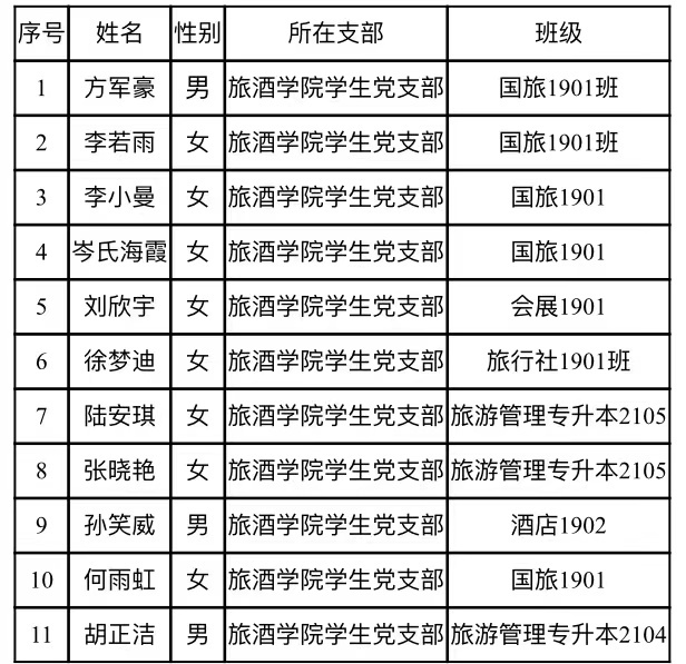 经党组织一年来的培养教育和考察,预备党员方军豪等十一名同志预备期满,拟在近期召开党员大会分别讨论方军豪等十一名同志的转正问题。为了进一步增强发展党员工作的透明度,严格组织发展工作程序,防止不正之风,确保发展新党员的质量,现将预备期满的预备党员名单公示如下: