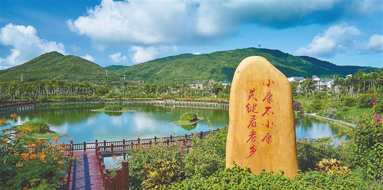 三亚博后村哎岬湖湿地公园,“小康不小康 关键看老乡”的嘱托被村民刻在石头上。海南日报记者 封烁 摄