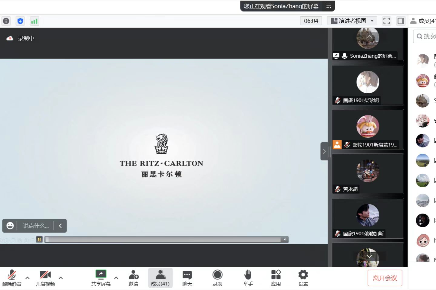 讲座伊始,酒店招聘负责人Sonia Zhang以一个动漫视频为此次宣讲的开端,充分展示丽思卡尔顿的“我们以绅士淑女的态度,为绅士淑女们忠诚服务”的座右铭。接着,Sonia Zhang介绍了丽思卡尔顿的基本情况、招聘岗位、待遇情况,并着重介绍丽思卡尔顿的高潜质实习生项目:通过推荐、评选、培训三步骤培养高质量实习生,为集团提供储备人才。最后,Sonia Zhang邀请学生进入群聊,为学生答疑解惑并表示期待与学生的12月11日的线下招聘会。