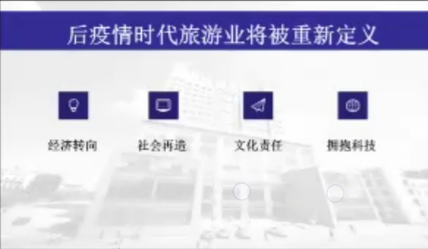 刘海洋老师以此结论,引出了本次会议关于“后疫情时代旅游业如何发展”的主题,并通过经济、社会、文化、科技四个方面向学生重新定义旅游业。