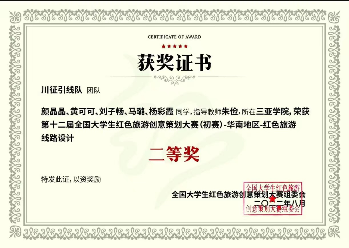 以赛促教、以赛促学,专业教师指导学生参加全国大学生红色旅游创意策划大赛获得华南地区一等奖1项,二等奖3项;参加2022年海南自贸港创业大赛获得优秀奖1项;参加粤港澳大湾区海洋旅游创新大赛获三等奖1项。新成立专业社团旅游创新竞赛联盟,组织学生参加粤港澳旅游产品策划与定制大赛等,不断提高应用型人才培养质量。