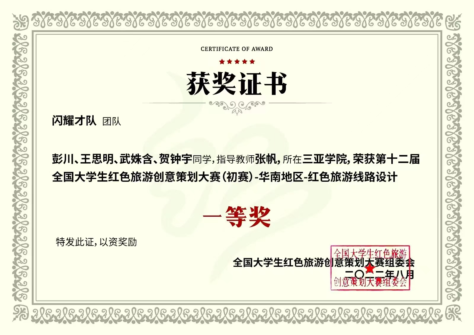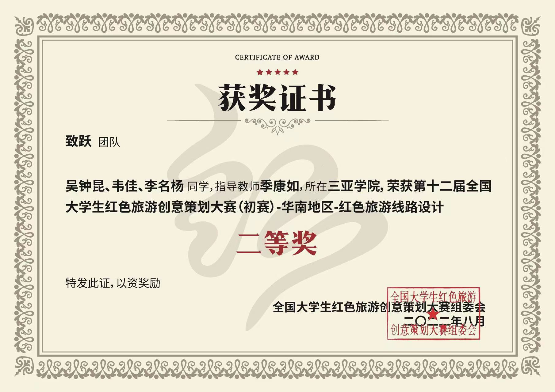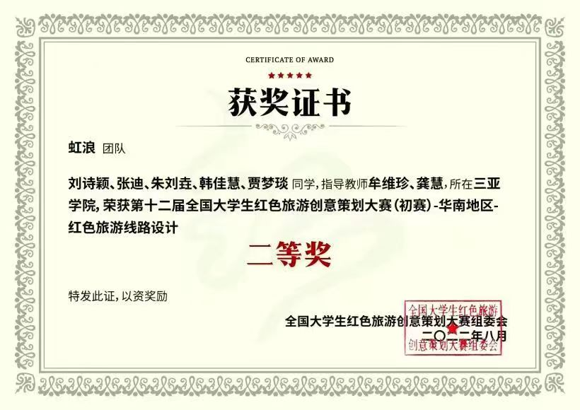 以赛促教、以赛促学,专业教师指导学生参加全国大学生红色旅游创意策划大赛获得华南地区一等奖1项,二等奖3项;参加2022年海南自贸港创业大赛获得优秀奖1项;参加粤港澳大湾区海洋旅游创新大赛获三等奖1项。新成立专业社团旅游创新竞赛联盟,组织学生参加粤港澳旅游产品策划与定制大赛等,不断提高应用型人才培养质量。