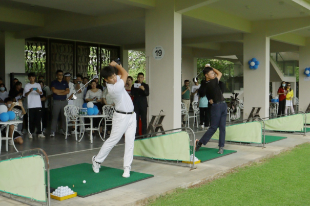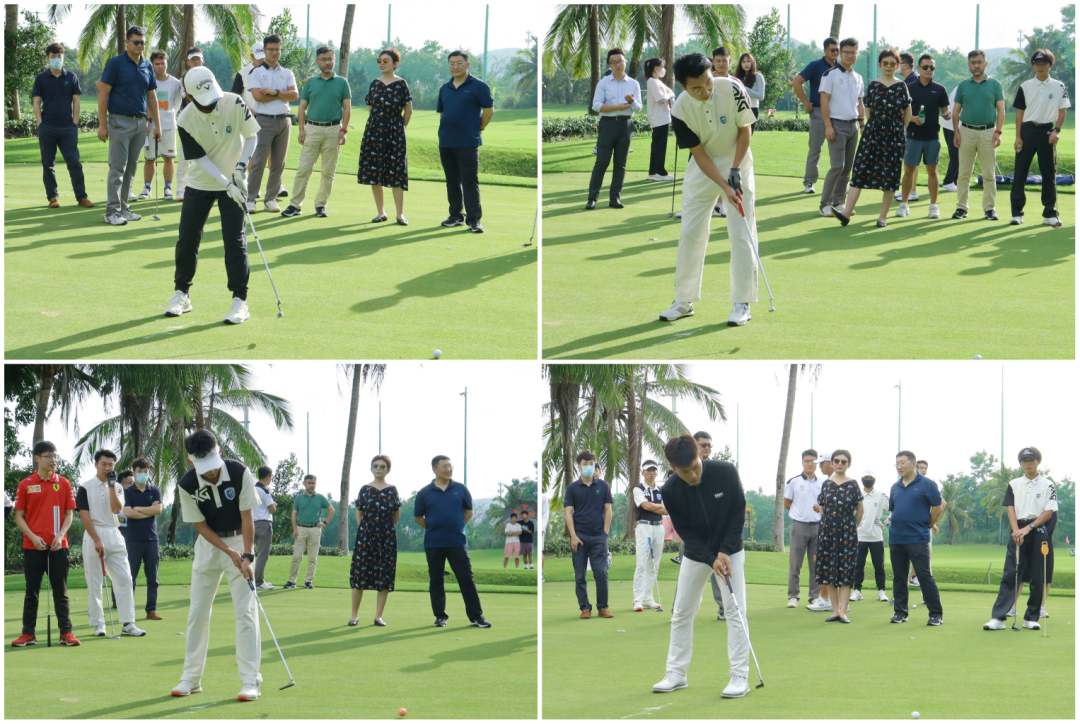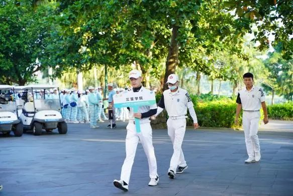 在高尔夫旅游嘉年华活动的开球仪式上,首先上场的是我院荣获全国高尔夫大学生联赛第六名和海南省高尔夫青巡赛第六名的19级球员霍子光和上届旅游嘉年华18洞挑战赛冠军的19级球员马乐强,其次出场的是20级球员林辰亮和原艺鑫,他们是球队的中坚力量,起到了承上启下的作用,最后是21级球员张博和杨阳,他们是冉冉升起的新星,他们以饱满的热情、稳定的发挥、拼搏的精神,为我们呈现了一场精彩纷呈的高尔夫开球仪式。