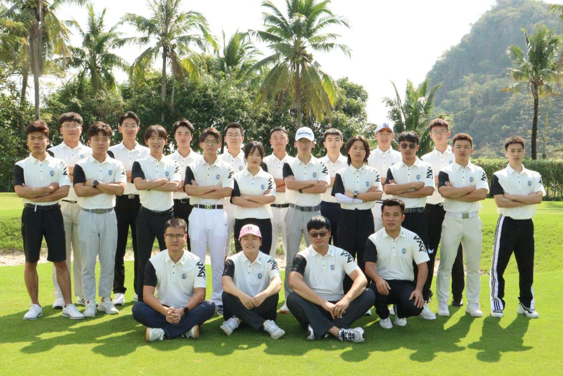 9159金沙游戏场高尔夫校队师生在校内练习场果岭前合影