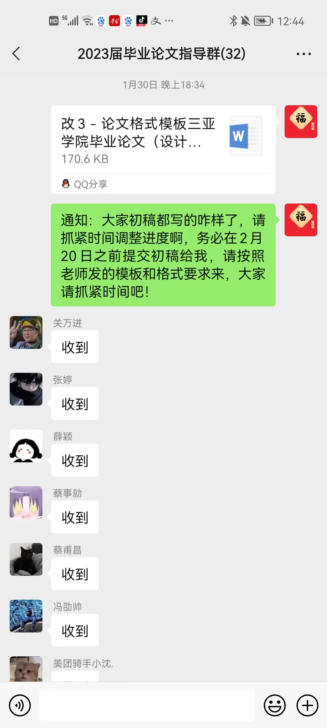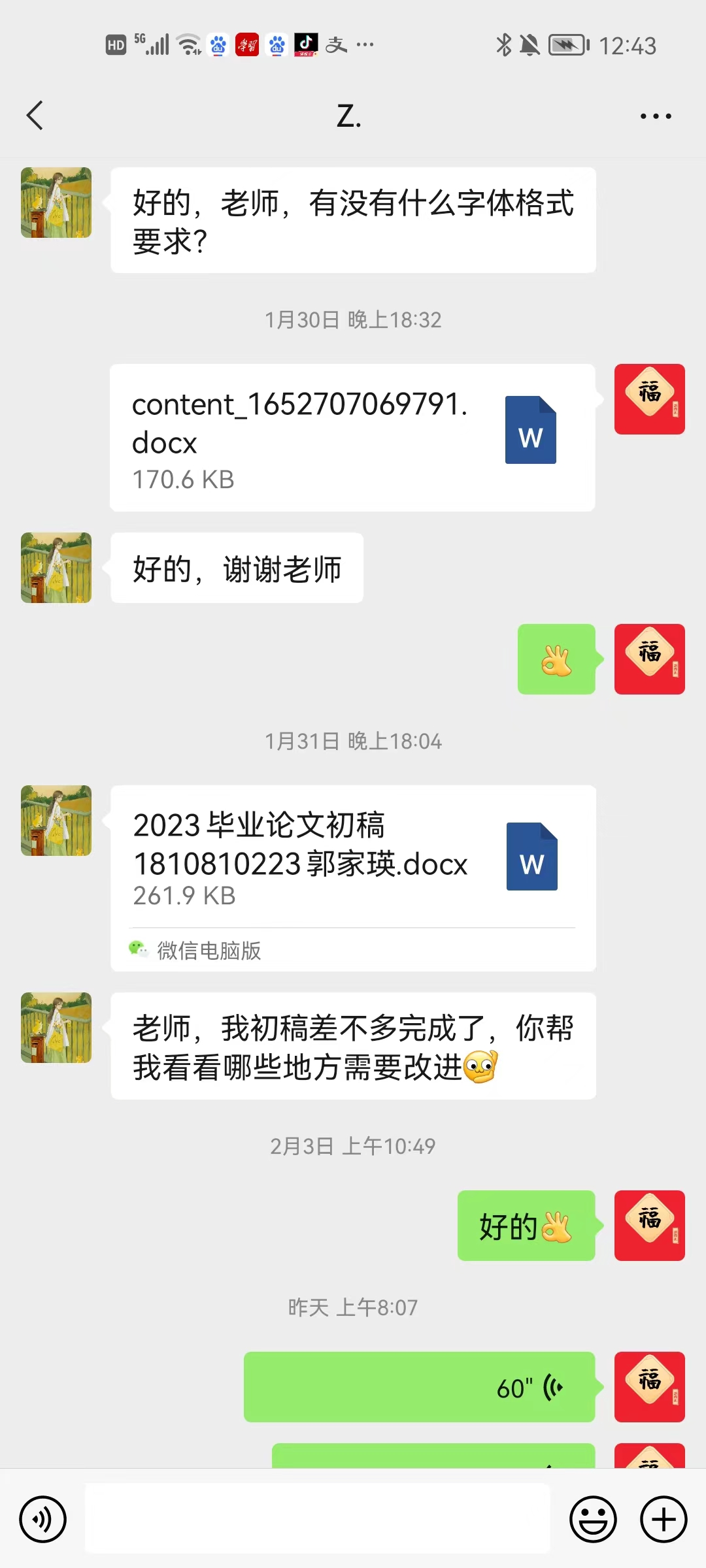 在毕业论文指导方面,胡老师主要负责指导31名2023届毕业生的毕业论文。在寒假期间,胡老师积极指导学生完成系统材料提交、审核等工作,有计划的完成毕业论文撰写工作;按照学院毕业论文撰写进度安排积极指导学生完成初稿撰写,目前已经有10名左右学生完成初稿并提交,其他学生也将在2月20日之前完成初稿撰写工作。