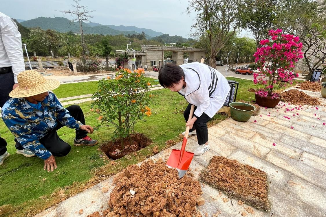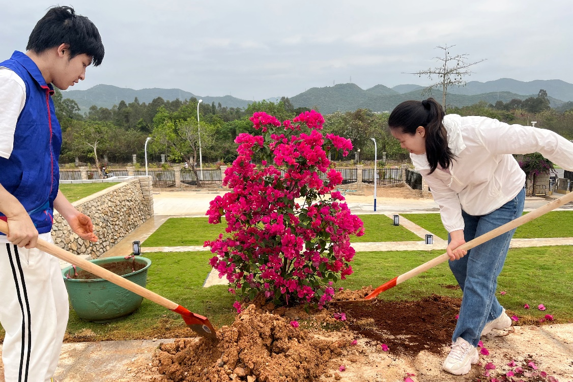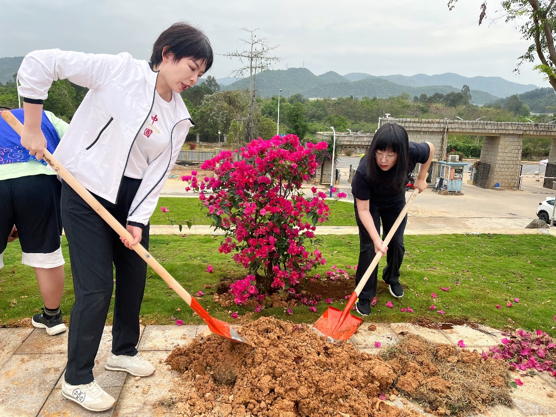 校领导高一兰(右)和我院党总支副书记吴吟秋种植三角梅