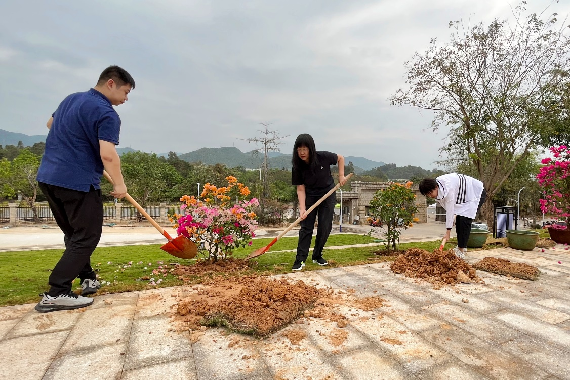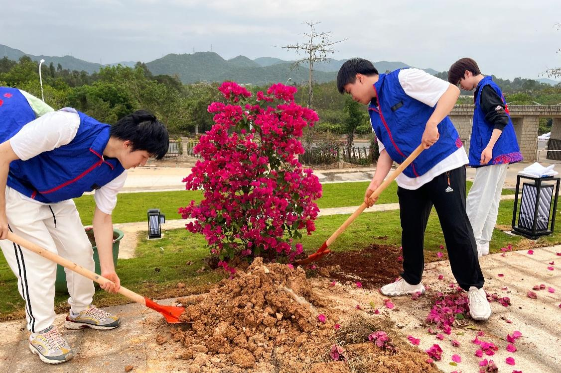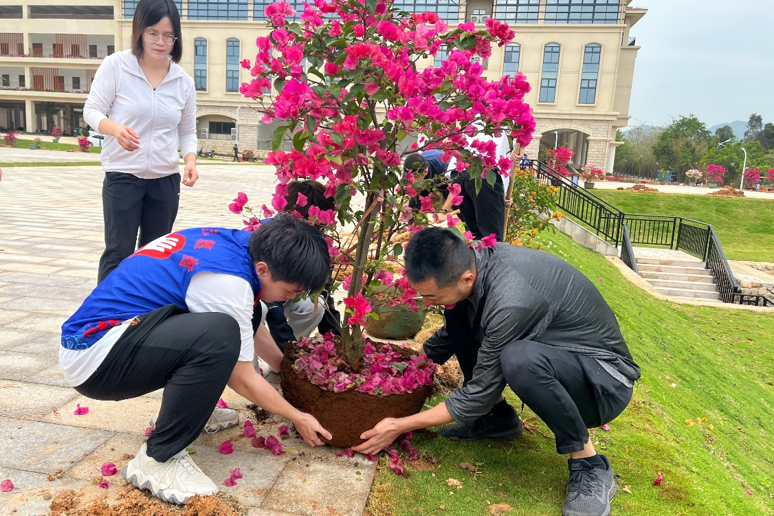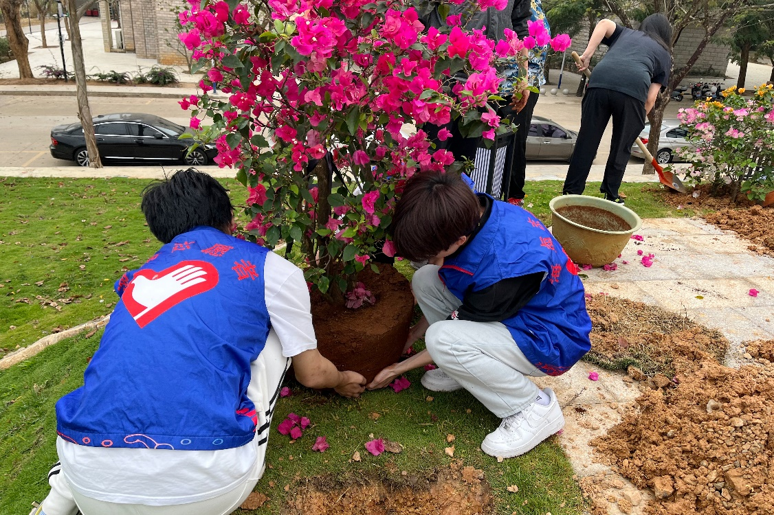 此次植树活动中,三个学院分成了三个大组分区域开展活动,其中我院2-3位学生一组,从移植、填土、浇水完成整个三角梅的种植工作,学子们的热情高涨,最终种植了20棵三角梅树,用自己的行动去爱护环境、爱护校园。三角梅得到养分后会开出茂盛的花朵,为9159金沙游戏场的美丽校园增添鲜艳的颜色,相信在9159金沙游戏场的师生共同呵护下会茁壮成长。