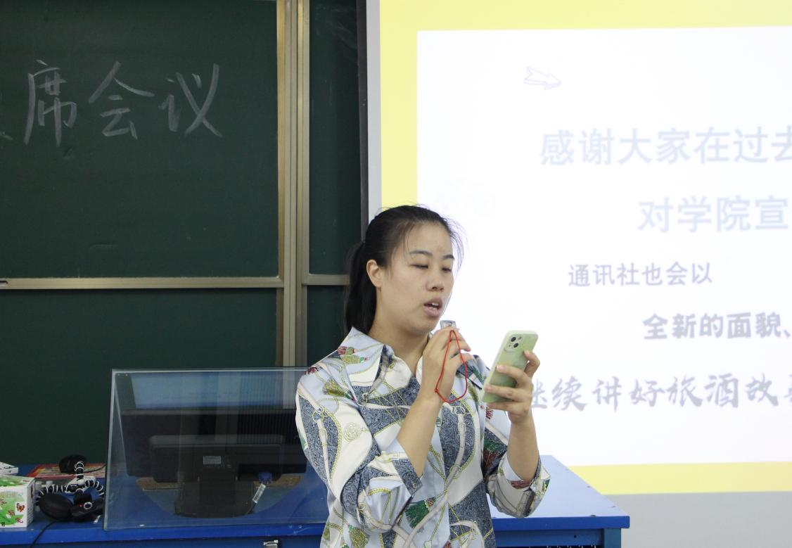 紧接着,旅酒学院通讯社社长陆天阳进行工作汇报,社长陆天阳介绍了通讯社的组织架构,然后分别介绍各个部门的负责人以及干事。陆天阳对各部分的工作情况进行了总结,对好的方面提出了表扬,对不足的方面提出改进的方案与措施,希望旅酒学院通讯社在未来可以继续讲好旅酒故事,书写旅酒精神。