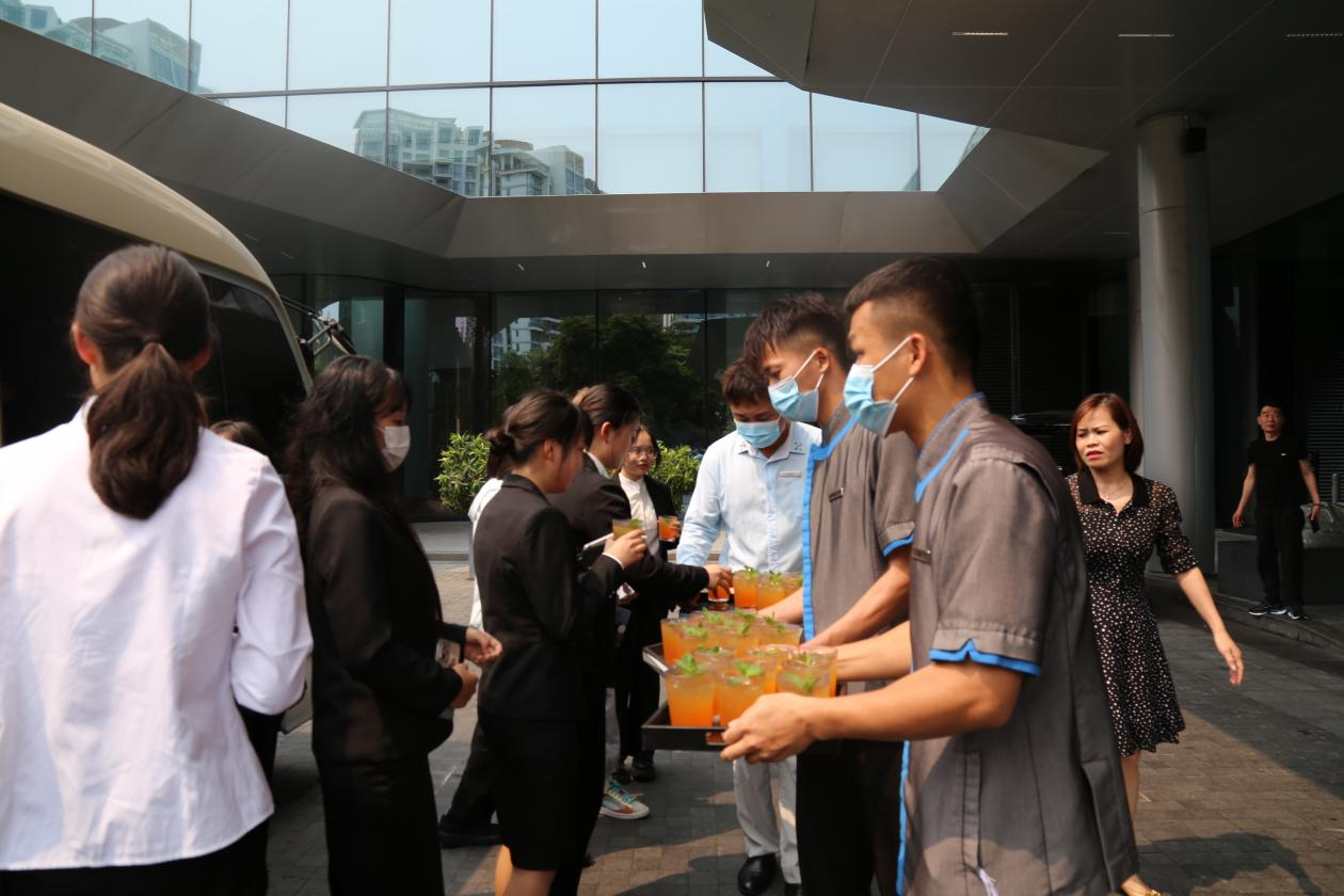 进入大堂,我院学生展开旅酒学院旗帜,与老师,酒店人员进行拍照留念。