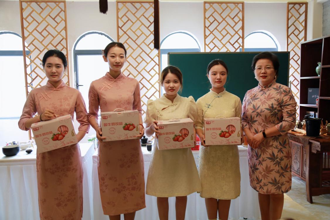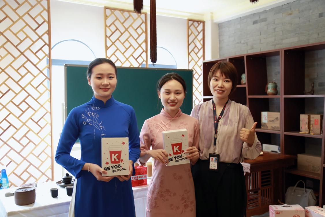 获得最佳创意奖茶艺社团的是付俊芳和徐源与李微经历合影留念