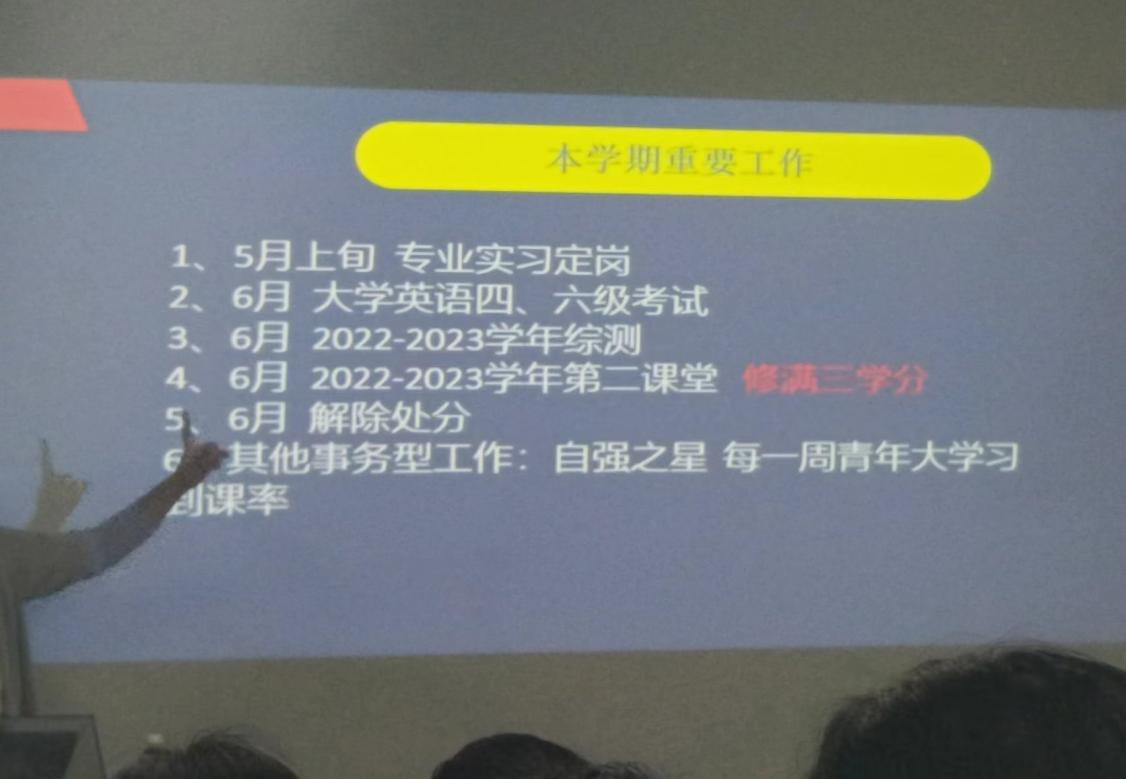 紧接着,李琴老师提醒学生们毕业资格、学位资格的审核条件,包括毕业要求的最低学分、通识核心课程需达到三个不同模块、冬季短学期、是否有处分、体测达标、“第二课堂”需修满三学分和平均学分绩点达标。李琴老师向学生们分享获得证书情况,并公示出各班级前三个学期学业成绩情况以及准备考研留学学生的比例。随后,李琴老师提到本学期重要工作安排,五月会进行专业实习定岗、六月会迎来大学英语四六级考试及综测、第二课堂和解除处分的工作安排。