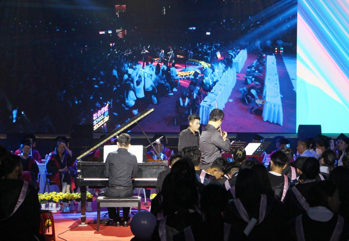 接着由音乐学院的三位音乐教师带来了《山鹰之歌》的三重奏演奏,激情的音乐表现出每个人对未来充满了希望,也是教师对学生最好的祝愿。