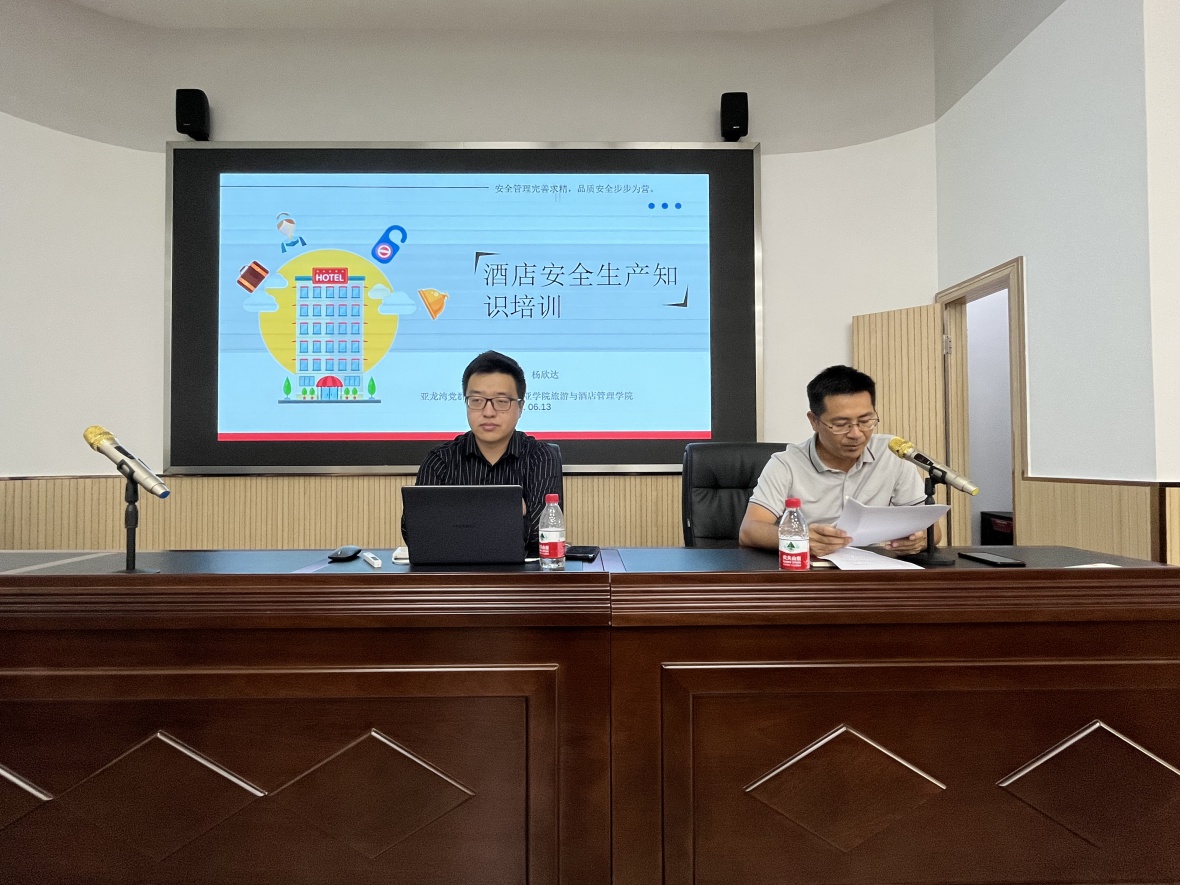 为了积极贯彻党的二十大会议精神,以及习总书记关于安全生产重要批示精神,树立安全发展理念,筑牢生命重于泰山的安全观,切实抓好区域内酒店企业安全生产工作,进一步提高员工安全意识,增强防范能力,有三亚市亚龙湾旅游度假区党群服务中心举办的“2023年度酒店企业安全生产知识培训”于2023年6月13日在亚龙湾旅游度假区党群服务综合中心召开。我院酒店管理专业杨欣达老师应邀参加此次讲座并进行了培训授课。