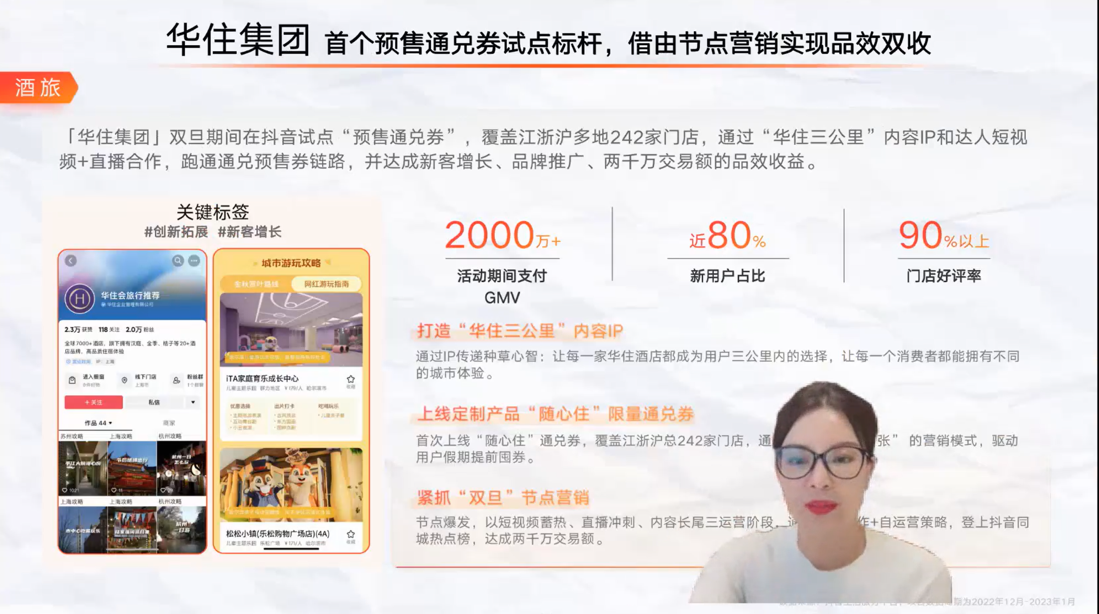 唐晓燕总监从如何让酒店的APP或者酒店自身公众号与自媒体引流结合,让酒店的客户端更好的曝光在自媒体的光环之下,并促进大众消费的议题出发,进行解读。唐晓燕总监认为酒店自媒体运营的难点在于怎样让大家更好的去接受而且不排斥,并从上海雅居乐万豪侯爵酒店、华住集团、本土品牌酒店三个案例点,深入浅出的使同学们明白国际连锁品牌高端酒店、度假型酒店与城市商务型酒店在自媒体运营与营销上的玩法不同。国际连锁品牌高端酒店和度假型酒店的选品需要多样化,最好有一个入门级产品,让周边用户,即增量用户先迈入大门;其次,不同于城市商务酒店的便捷性,高端酒店和度假酒店在产品组合上一定要考虑给客人带来的体验感,在选择达人带货上也要精准匹配到生活方式、探险旅游类的达人;第三点是打包套餐中纳入权益包的组合,比如让客人在入住后能带走一些线下的实体商品,以获得与OTA预订不同的入住体验,并成为未来口碑传播的锚点。