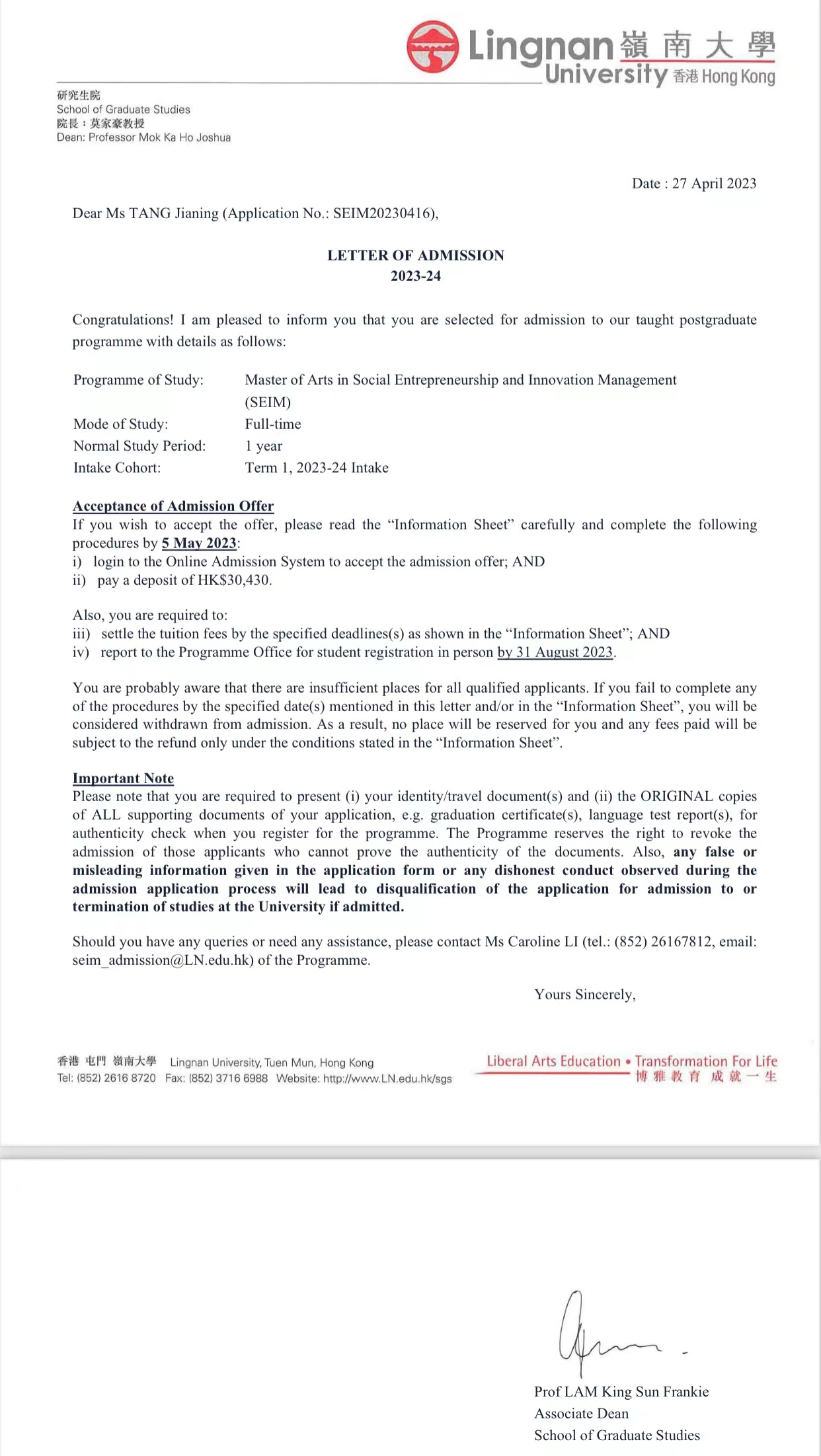 唐佳凝收到香港嶺南大学硕士研究生offer