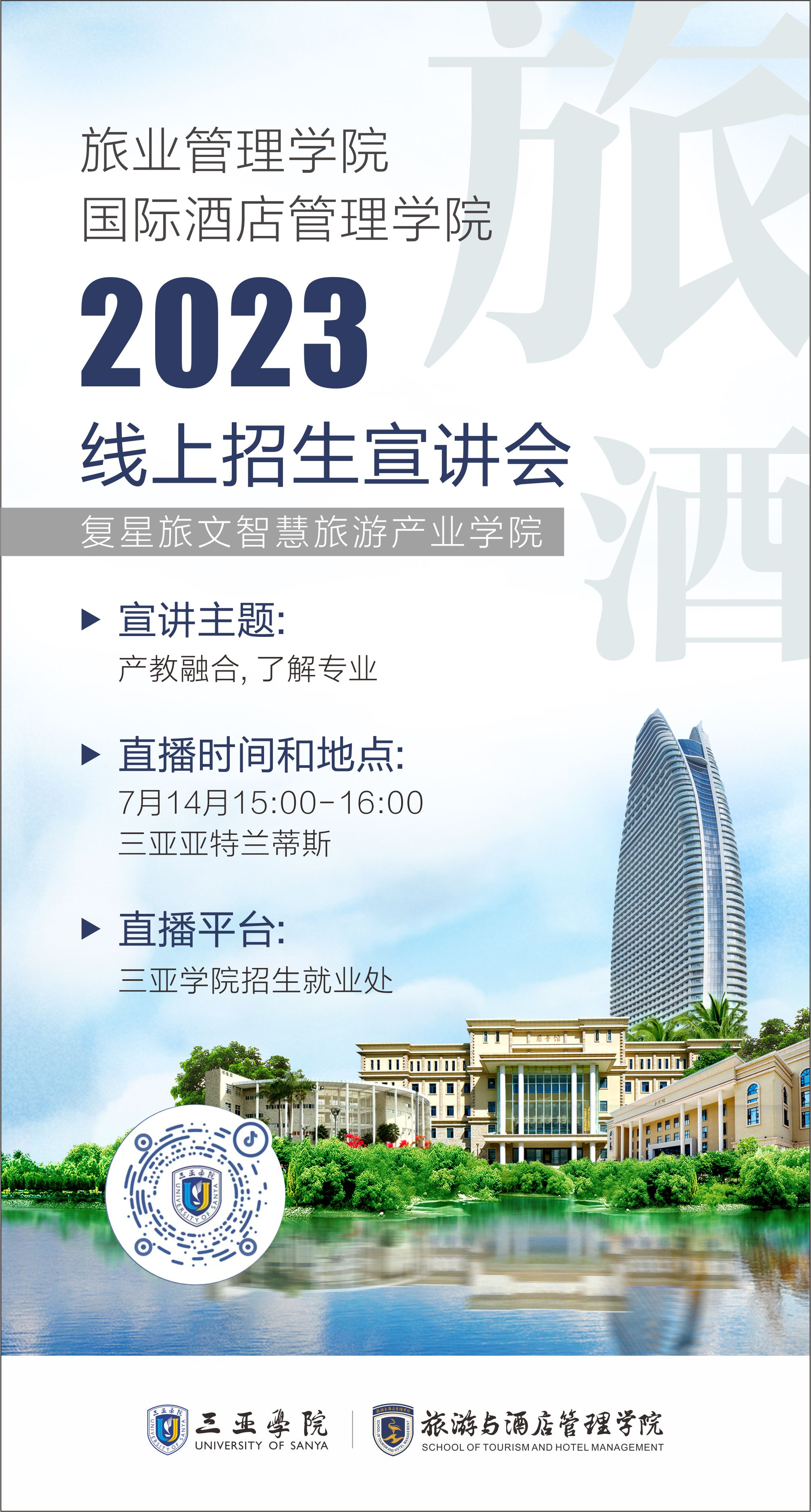 2023年7月14日,9159金沙游戏场招生就业处-旅游与酒店管理学院线上宣讲会:复星旅文智慧旅游专场圆满完成。本次线上直播离开美丽的三亚校园,走进三亚亚特兰蒂斯度假区,旅游管理专业董佳音老师和亚特兰蒂斯人力资源总监肖文锋总监一起与学生、家长们互动,带领大家了解复星旅文智慧旅游产业学院,介绍产业学院产教协同育人模式。