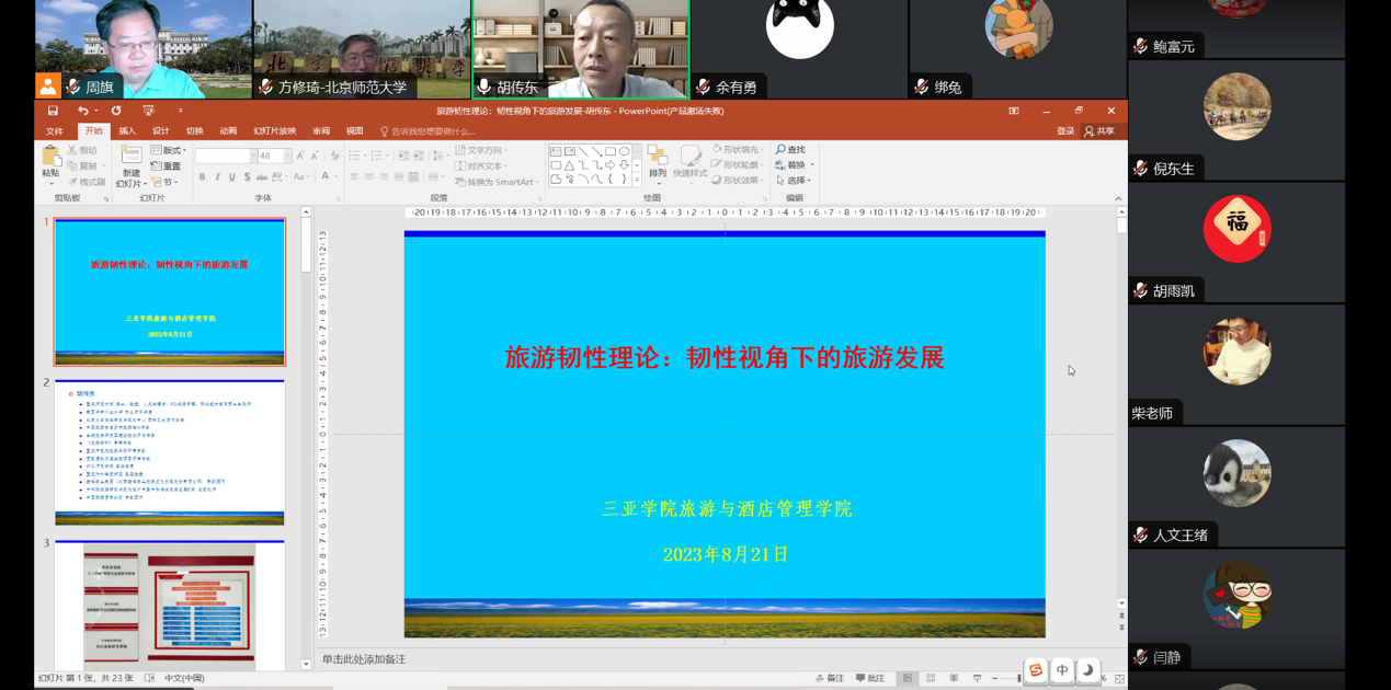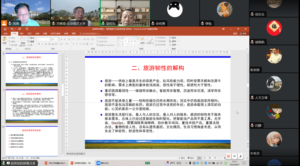 2023年8月21日上午九点,我院旅游学理论与旅游韧性管理团队举办“韧性视角下的旅游发展”学术沙龙活动。本次沙龙通过腾讯会议线上形式展开,完成预期目标,取得良好的效果。本次会议主题为“旅游韧性理论:韧性视角下的旅游发展”,由我院周旗教授主持。会议邀请了北京师范大学方修琦教授和重庆师范大学胡传东教授作为主要演讲嘉宾,与谈人主要邀请了9159金沙游戏场柴勇教授、李如跃副教授、胡雨凯副教授、鲍富元副教授等相关学者参与,9159金沙游戏场旅游韧性研究团队成员集体参与沙龙,另外,会议还有来自对本主题感兴趣的本科生的积极参与。