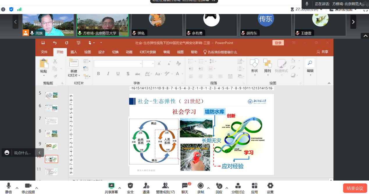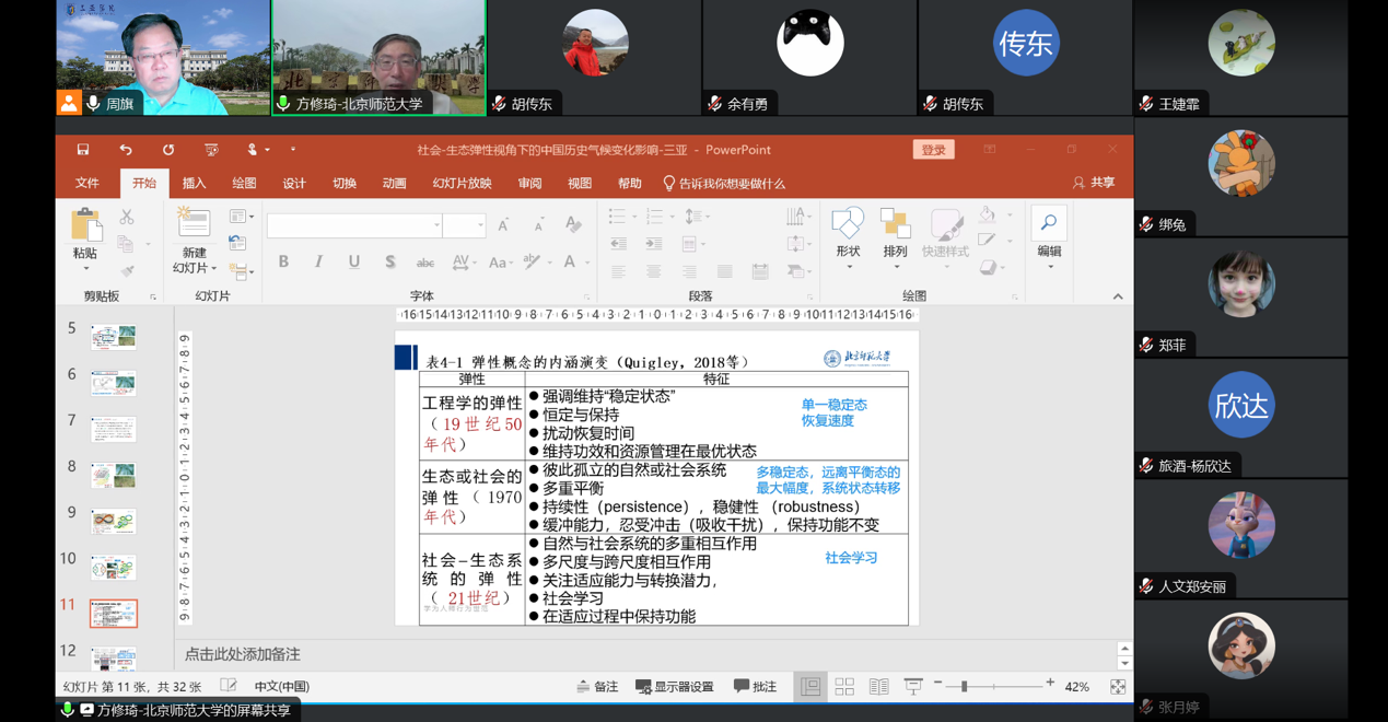 两位教授分别针对本次会议主题做了精彩演讲,方修琦教授系统介绍了韧性概念从工程韧性、生态韧性到社会生态韧性的演变过程,强调了韧性的多尺度镶嵌过程与机制;以气候变化影响与中国历史弹性增损为例,系统介绍了用韧性视角解决理论与实践问题的路径与方法,从众多历史事件剖析中揭示了“冷抑暖扬” 韵律及其对应的两种弹性状态、减损弹性适应适应气候变化、适应气候变化与社会-生态弹性增强的系列结论,总结了“影响表现——响应过程——状态转换——尺度关联”韧性研究模式,对团队开展旅游韧性研究颇具指导价值。