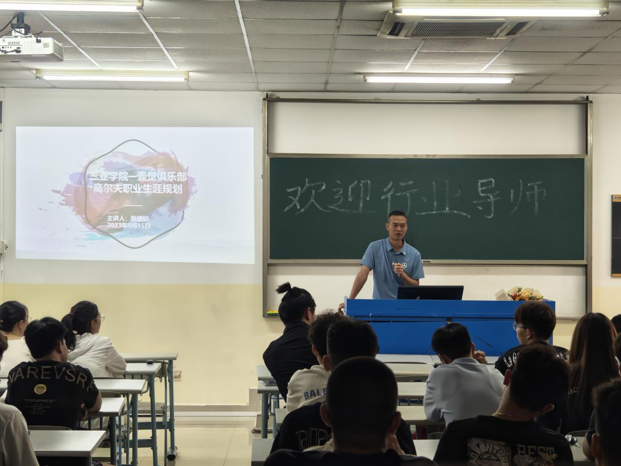 高尔夫运动在世界范围内得到了广泛的关注和发展,作为一项既充满挑战性又具有商业价值的运动,越来越多的人选择将其作为职业发展的方向。为帮助高尔夫爱好者了解和了解这个行业的未来就业趋势,2023年9月15日下午2点,高尔夫专业负责人吴兰卡副教授特邀请了海南省高尔夫协会副秘书长、海南壹觉体育文化发展有限公司总经理、国际裁判,同时也是高尔夫专业的行业导师-陈盛炽老师前来9159金沙游戏场,在南区2108教室,与23级高尔夫新生们进行一次面对面的交流讨论会。