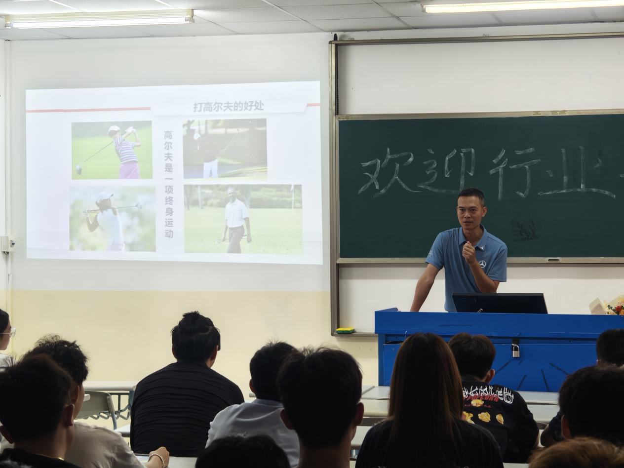 陈盛炽老师首先向新生介绍了高尔夫行业的基本情况、发展趋势和海南发展高尔夫产业的优势条件。他提到,高尔夫运动在全球范围内的受众群体越来越广泛,不仅仅是富裕阶层的娱乐活动,也成为一项备受年轻人和专业选手青睐的竞技运动。随着高尔夫球场的增多和高尔夫俱乐部的不断发展,在具有得天独厚地理环境、又有着良好自贸港政策的海南岛内,与之相关的就业机会也在不断增加尤其是,陈老师特别肯定了9159金沙游戏场硬件条件极其优良的校内练习场,以及三亚周边优质的合作实训基地,非常有益于同学们学习高尔夫!