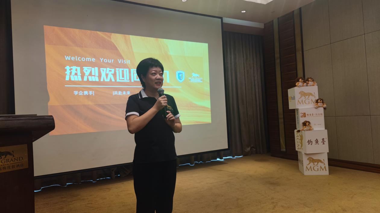美高梅酒店行政运营经理、人事总监等团队高管在酒店欢迎同学们的到来。首先,有酒店人力资源部总监连婧女士致辞欢迎同学们和老师来到美高梅度假酒店。随后行政运营经理李才鑫为同学们分享美高梅的品牌文化及主题定位,并从产品创意方面做深度探讨,同时,与同学们之间展开互动交流。在认真的授课学习后,酒店为同学们准备了精美的茶歇甜点和饮品。