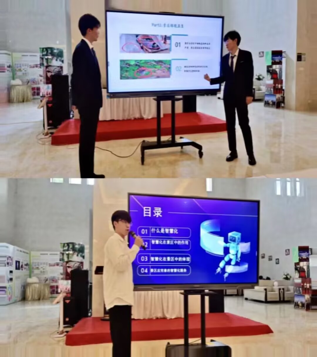 新生们通过此次活动,深入了解和认识到旅游行业的多个方面,同时锻炼了自己的演讲和组织能力。调研内容分为四大调研主题包括:旅游岗位大搜索、大家来找茬、解密景区构成、智慧化在景区中的体现,每组由四位同学进行演讲,以两两PK的形式精彩呈现,评委们对调研内容、演讲模式、视频制作、互动模式等情况予以评判。每个团队充分发挥自己的特长,采用多种方式进行展示,令人眼前一亮。