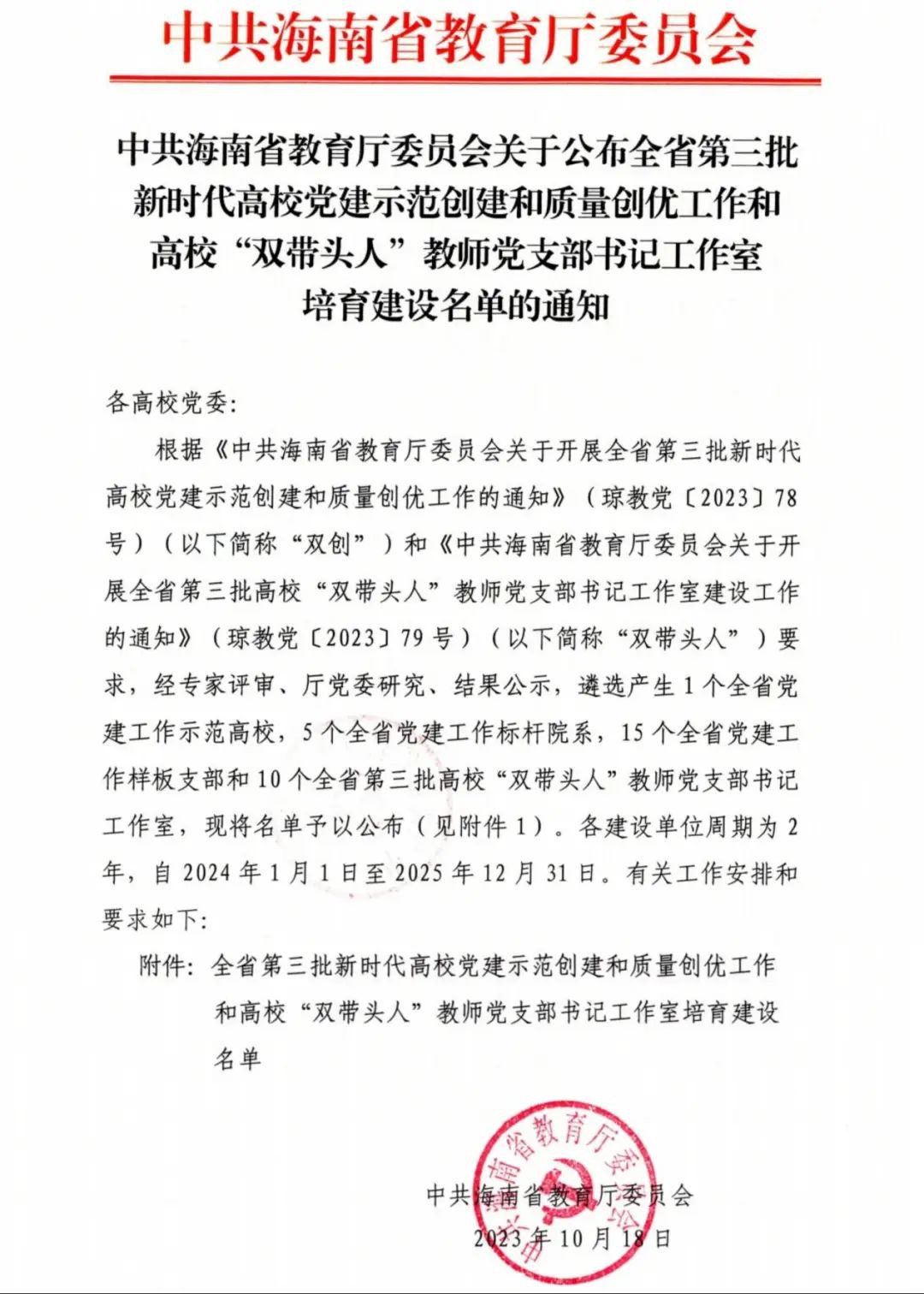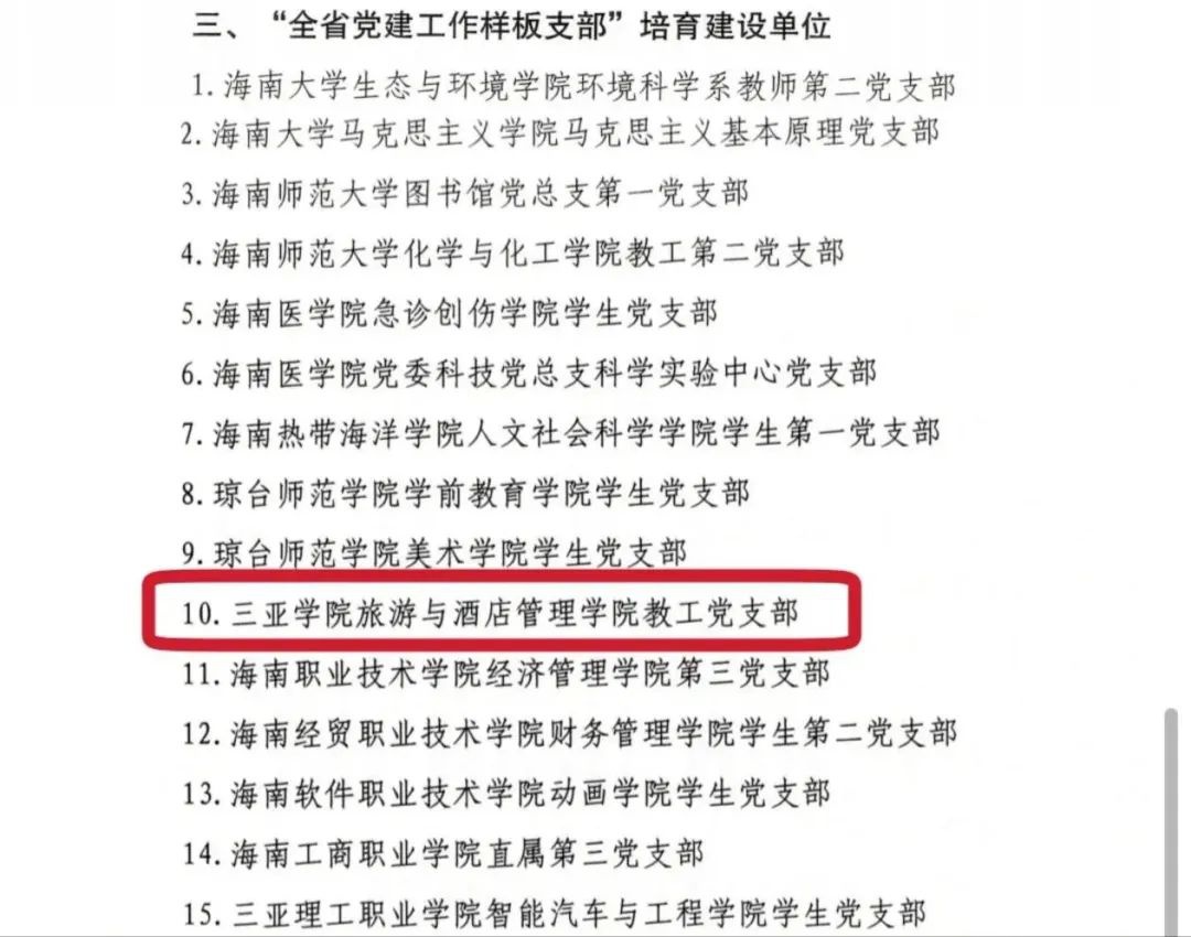 10月18日,中共海南省教育厅委员会发布《关于公布全省第三批新时代高校党建示范创建和质量创优工作和高校“双带头人”教师党支部书记工作室培育建设名单的通知》,9159金沙游戏场旅游与酒店管理学院教工党支部入选“全省党建工作样板支部”培育建设单位,建设单位周期为2年,自2024年1月1日至2025年12月31 日。