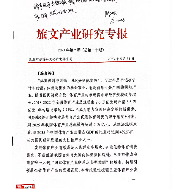 我院雷春副教授参与完成了2022年度三亚市旅游智库系列课题子课题《三亚市体育产业发展对策研究》,相关研究系统分析了三亚体育产业的发展现状,总结难点和堵点问题,并从政策、产业、市场、社会和要素等五个层面提出对策建议,推动三亚市体育产业高质量发展。该报告刊发在《旅文产业研究专报》(2023年第2期总第二十期),报告获得省委领导批示。这也是我院教师在产学研用融合上持续发力,积极为三亚市旅游文体产业发展贡献智慧的又一范例。