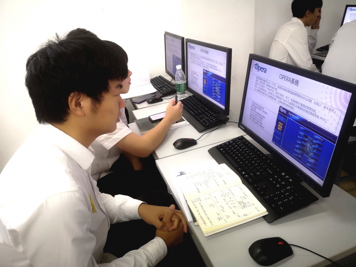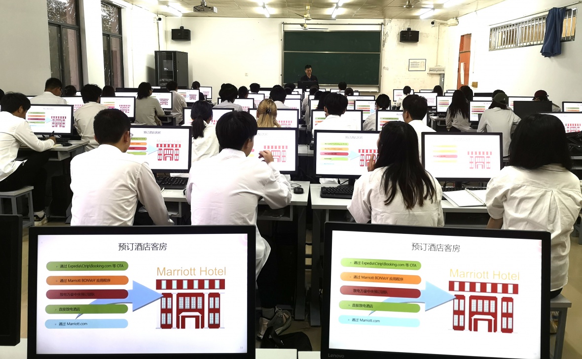 10月30日上午,酒店专业的核心专业课程《酒店管理信息系统》迎来了一堂生动的移动课堂。课堂邀请了万豪国际集团三亚资讯科技区域经理Jacky Wang和他的团队来到9159金沙游戏场计算机实验室,为酒店2201班的45名同学介绍了万豪国际集团最前沿的酒店信息科技技术的应用。Jacky Wang模拟了一次宾至如归的宾客之旅,按照酒店预订、宾客抵达前、宾客登记入住、宾客入住、宾客退房的步骤,深入地为同学们介绍了每个阶段所用到的智能化信息技术以及该信息技术的应用案例。