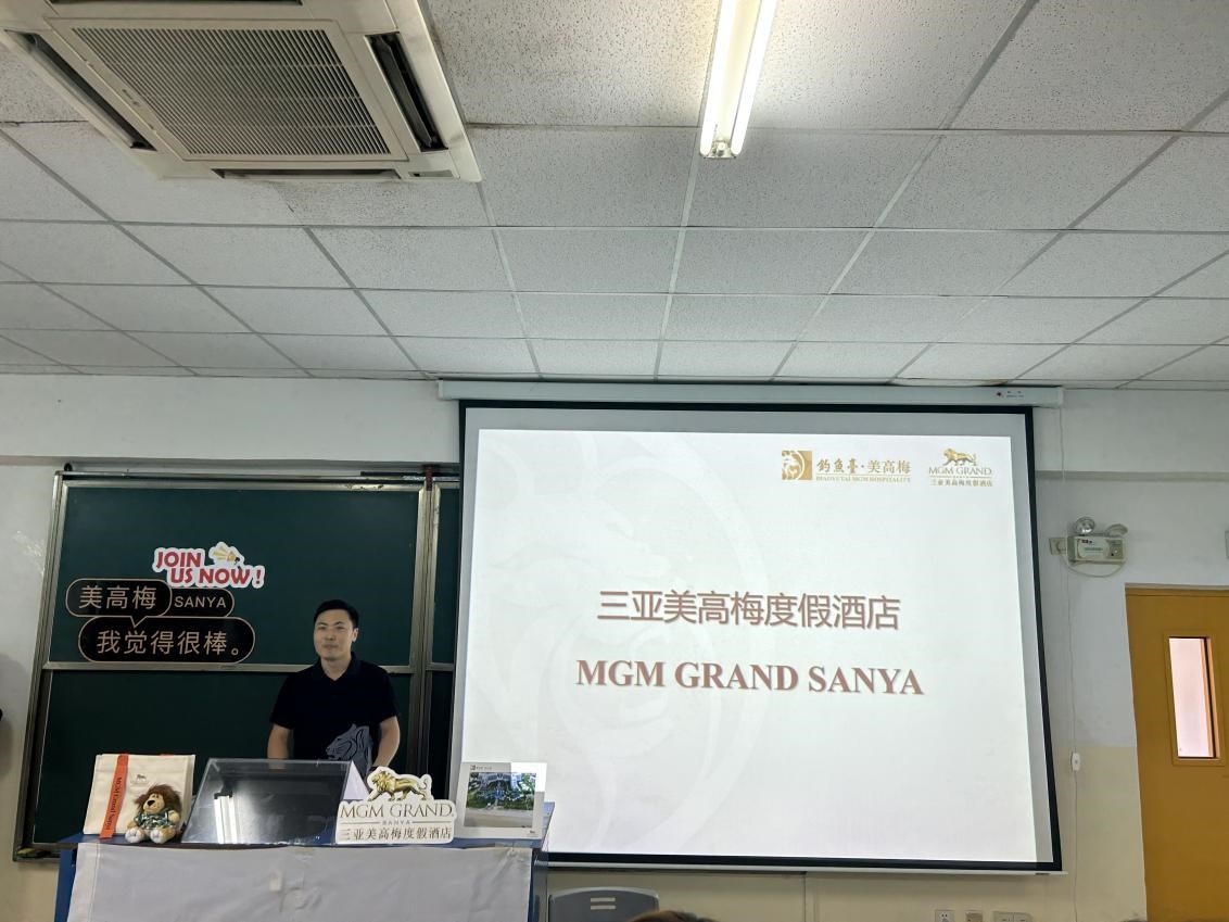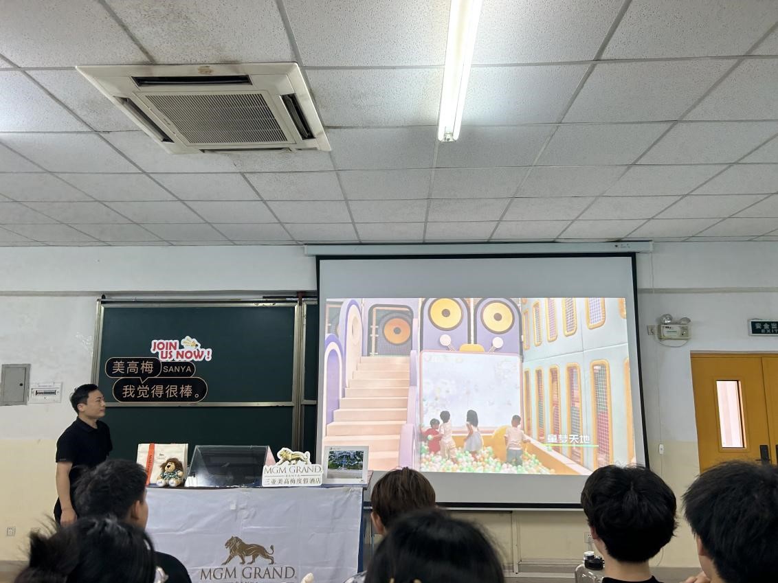 三亚美高梅度假酒店是位于海南省三亚市亚龙湾的中心的一家五星级酒店,拥有676间客房。本次招聘会主要由人事部的王经理进行宣讲,他在开始介绍了三亚美高梅度假酒店的发展起源和发展历程,随后通过播放美高梅酒店的宣传视频王经理向学生们简要介绍了酒店的内部环境和各具特色的娱乐活动区域,如临海大草坪,凌空海景滑索,儿童乐园,萌宠乐园,科罗娜沙滩吧等等,其中临海大草坪见证新人的浪漫和美好,美丽的海景加上完善的婚庆服务让越来越多的客人慕名前来举办婚礼。同时酒店的娱乐团队每周会在池畔进行具有拉斯维加斯特色的M SHOW表演,让美高梅的娱乐氛围达到高潮。