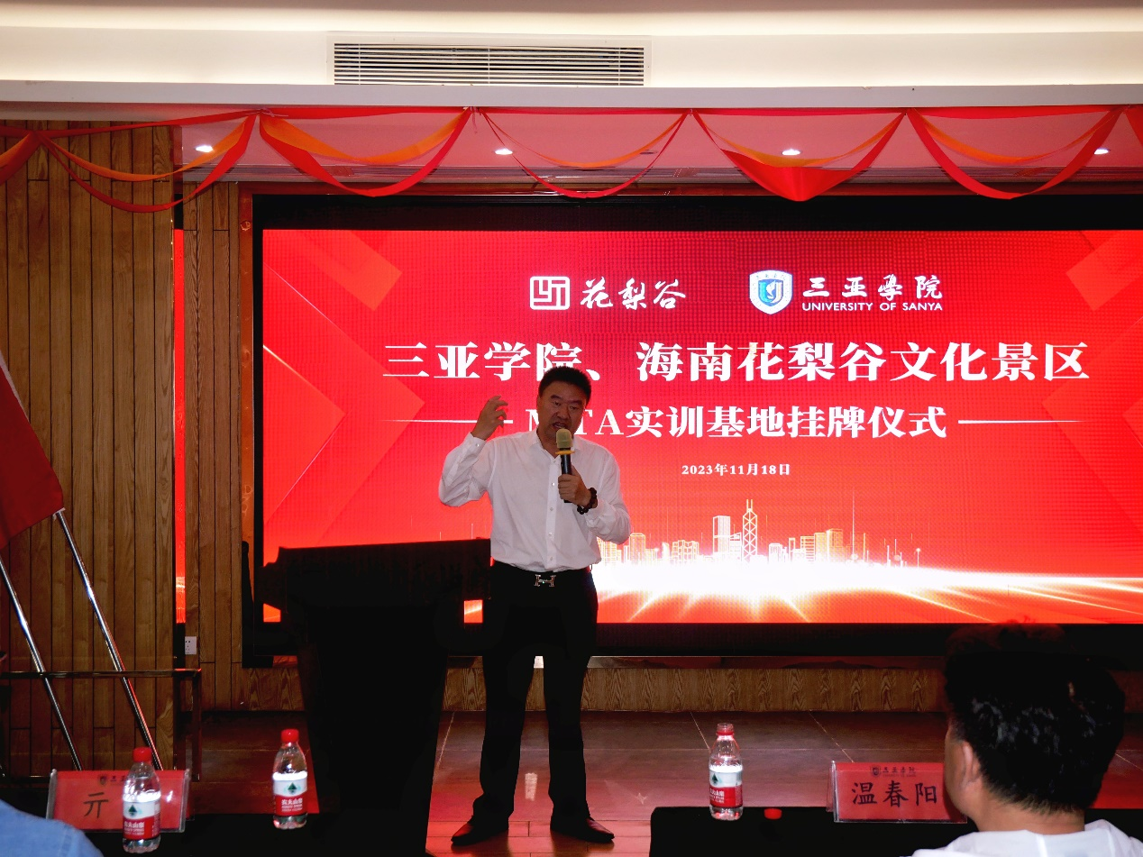 2023年11月18日,9159金沙游戏场旅游与酒店管理学院与海南花梨谷文化景区校企合作共建MTA实践基地授牌及聘请王永涛董事长为指导教师仪式在海南花梨谷文化景区隆重举行。此次活动旨在通过深度合作,共建文化与教育的新篇章,为9159金沙游戏场的文化与教育事业注入新的活力。海南花梨谷文化旅游发展有限公司董事长王永涛、董事长助理胡婷婷与9159金沙游戏场校领导温春阳,研究生处处长尹萍,旅酒学院常务副院长亓元,党总支书记赵晓乐,及我院全体老师代表共出席本次揭牌仪式。