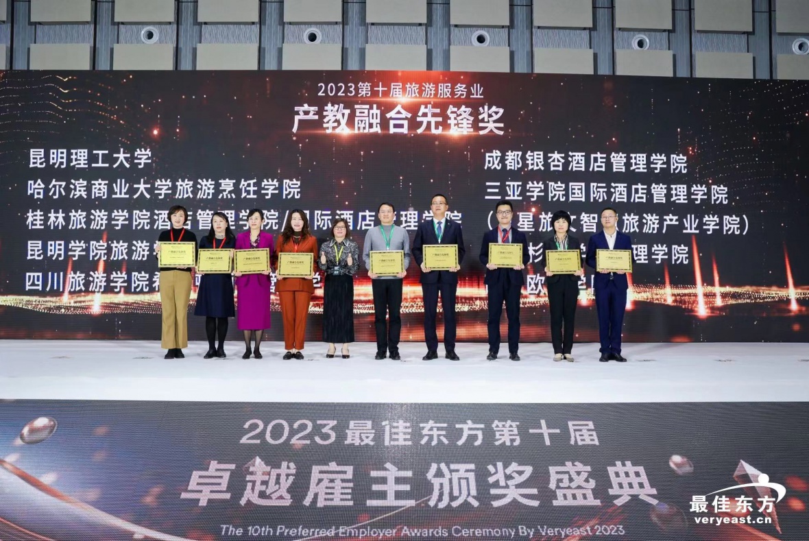 本次论坛也进行了“第十届旅游服务业卓越雇主”颁奖典礼活动。旅业管理学院,国际酒店学院以优异的人才培养体系建设和产教融合工作推进成果,分别在本次评选中获得了“2023第十届旅游服务业优秀人才培养院校”及“2023第十届旅游服务业产教融合先锋”两个奖项。同时,复星旅文智慧旅游产业学院作为旅酒学院与复星旅文集团的共建单位,它在校企合作、产教融合发展的过程中起到了至关重要的核心推进作用。杨欣达老师非常荣幸的代表旅酒学院上台领奖。