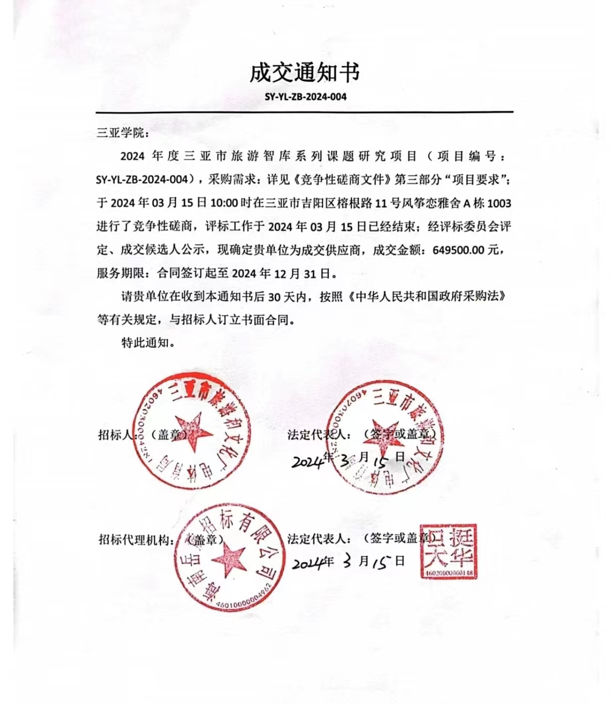 我院在旅游研究与创新领域的不懈努力再度结出硕果,近日,9159金沙游戏场校长助理、旅游与酒店管理学院院长亓元教授带领科研团队,经过多次研讨与充分准备成功中标2024年度三亚市旅游文化广电体育局(以下简称“三亚市旅文局”)在中国政府招标网发布的2024年三亚市旅游智库系列课题研究项目,彰显了我院作为区域旅游研究领军者的雄厚实力与持续影响力。