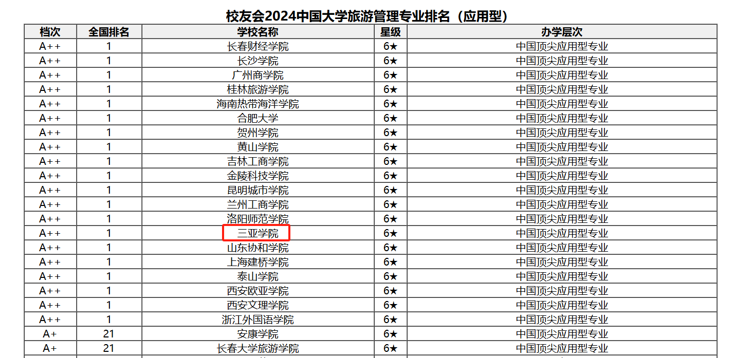 旅游管理专业(智慧旅游大数据)是教育部旅游管理专业虚拟教研室TOP100成员、海南省“省级一流本科专业”建设点、海南省特色重点学科方向,连续多年荣获中国大学一流专业(应用型)6星级专业。